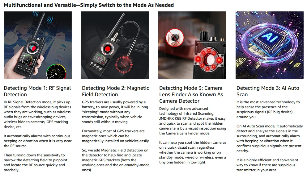 Улучшенная защита:Речь идет о RF детектор, Камера Определитель фальшивости gps-трекер детектор, подслушивающее устройство Определитель фальшивости 4-в-1 ошибка подметания устройства, предлагая 4 режима обнаружения: обнаружение радиочастотного сигнала для поиска беспроводного устройства ошибки, обнаружение магнитного поля для определения местоположения магнитного gps-трекера, поиск объектива камеры для обнаружения скрытой камеры, И автоматическое сканирование AI, чтобы автоматически определить, находится ли устройство RF на вашем месте. Защитите вас больше от любой потенциальной утечки конфиденциальности. Это приносит вам больше душевного спокойствия.