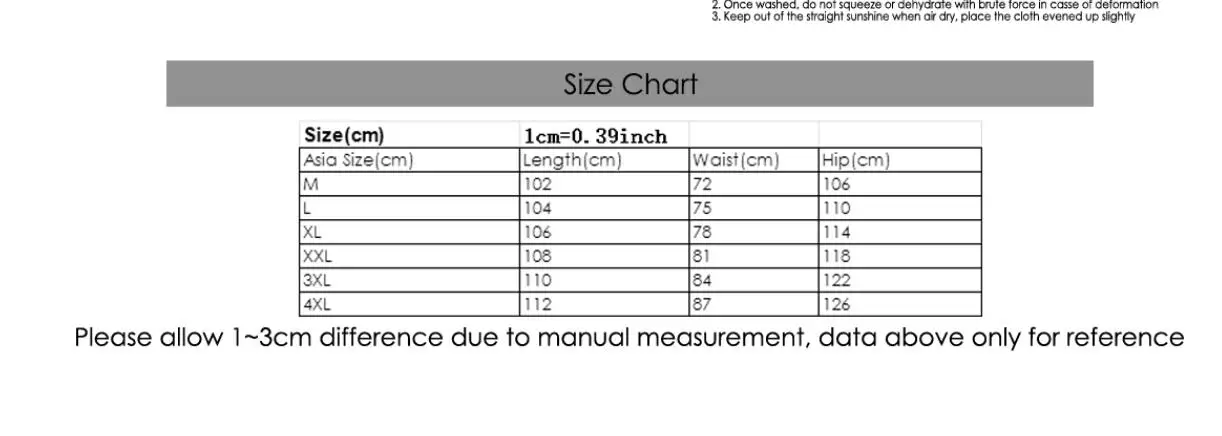 Материал: смесь синтетического волокнаЦвет: белый | Черный | Темно-серый | Светильник серый | Армейский зеленый | КрасныйРазмер: M / L / XL / 2XL / 3XL / 4XLРазмеры (см) 1 см = 0,39 дюймовРазмеры Длина обхват талии обхват бедерM 102 см 72 см 106 смL 104 см 75 см 110 смXL 106 см 78 см 114 см2XL 108 см 81 см 118 см3XL 110 см 84 см 122 см4XL 112 см 87 см 126 см