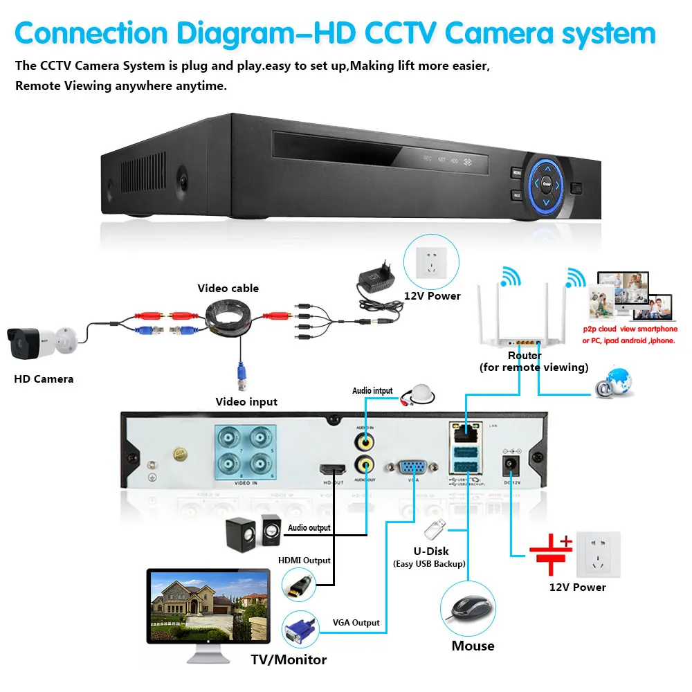 Простая настройка, всего 4 шага для просмотра мобильный телефон, просмотра видео в режиме реального времени из любого места и в любое время с помощью смартфона,Таблица или ПК с передовой технологией P2P, вы можете получить удаленный доступ к вашей системе в течение нескольких минут или меньше, нет необходимости в переадресации,Удаленный доступ никогда не был таким простым!