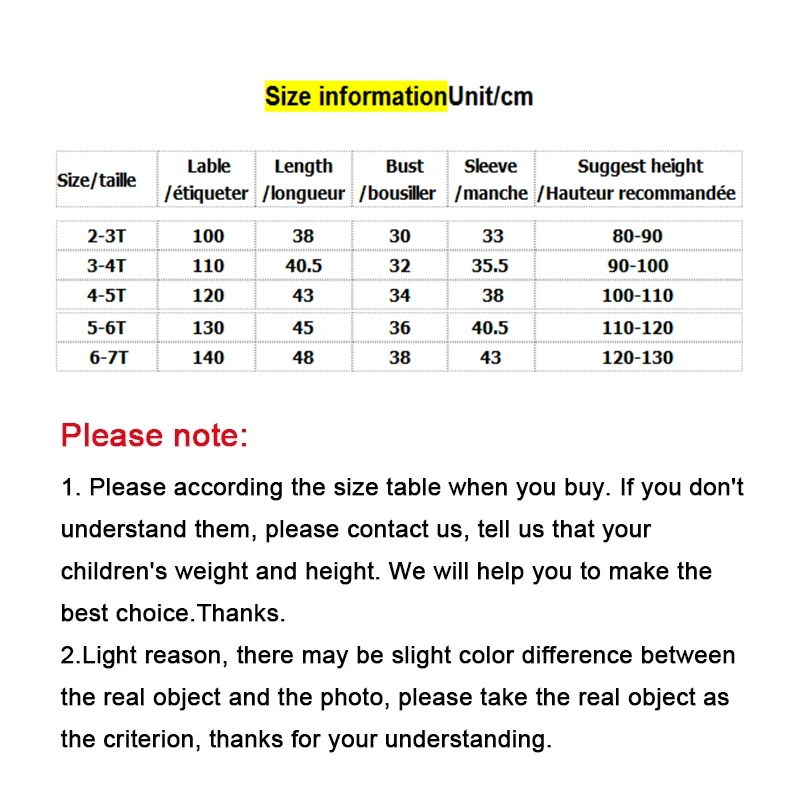 1. Пожалуйста, при покупке выбирайте размер в соответствии с таблицей размеров. Если вы не понимаете их, пожалуйста, свяжитесь с нами, сообщите нам вес и рост вашего ребенка. Мы поможем вам сделать лучший выбор. Спасибо. 2. Светильник причине Вас принять во внимание тот факт, быть s светильник разница в цвете между реальным товаром и его фото, пожалуйста, примите реальный объект, данный факт, спасибо за ваше понимание.