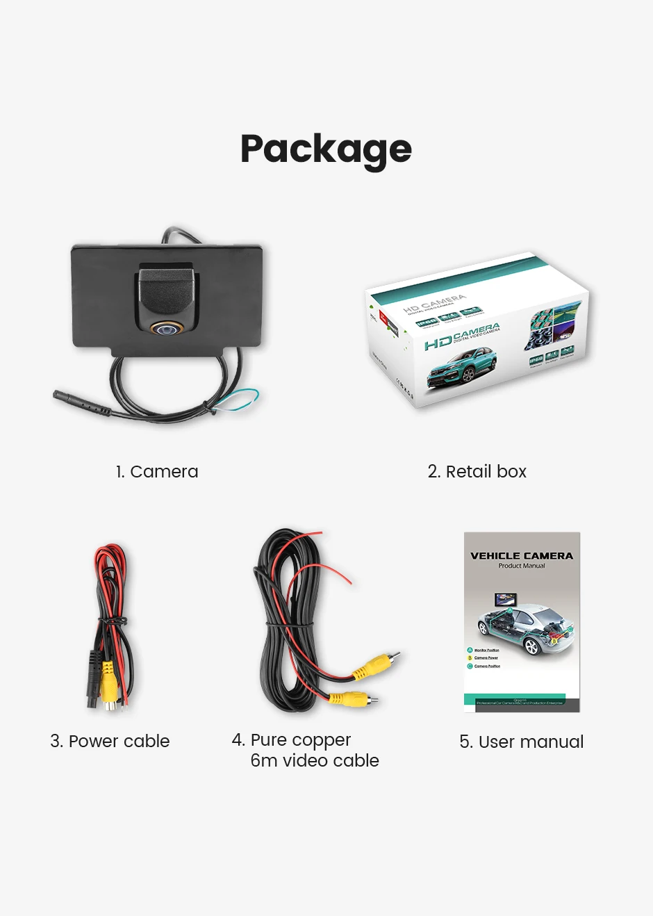 1. Камера заднего вида2. Розничная коробка3. Кабель питания4. Чистый медный 6 м видео кабель5. Руководство пользователя
