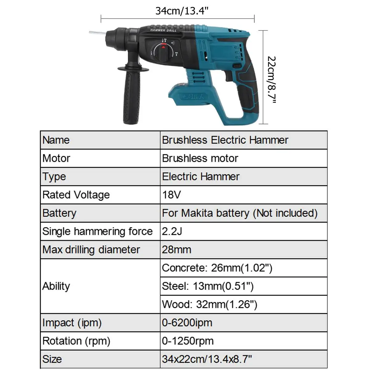 Перезаряжаемая электрическая молотковая дрель, дрель с вращающимся молотком, Беспроводная электрическая дрель для 18В Makita, электроинструменты с литиевой батареей