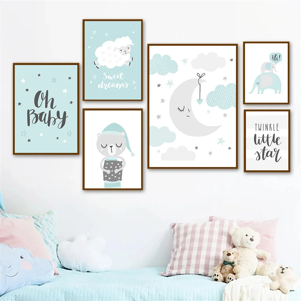 Настенная картина с изображением облаков и Луны, рисунок на холсте, голубой мультяшный слон, картина на стену в скандинавском стиле, декор детской комнаты