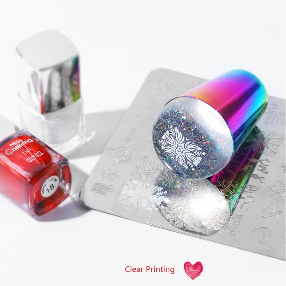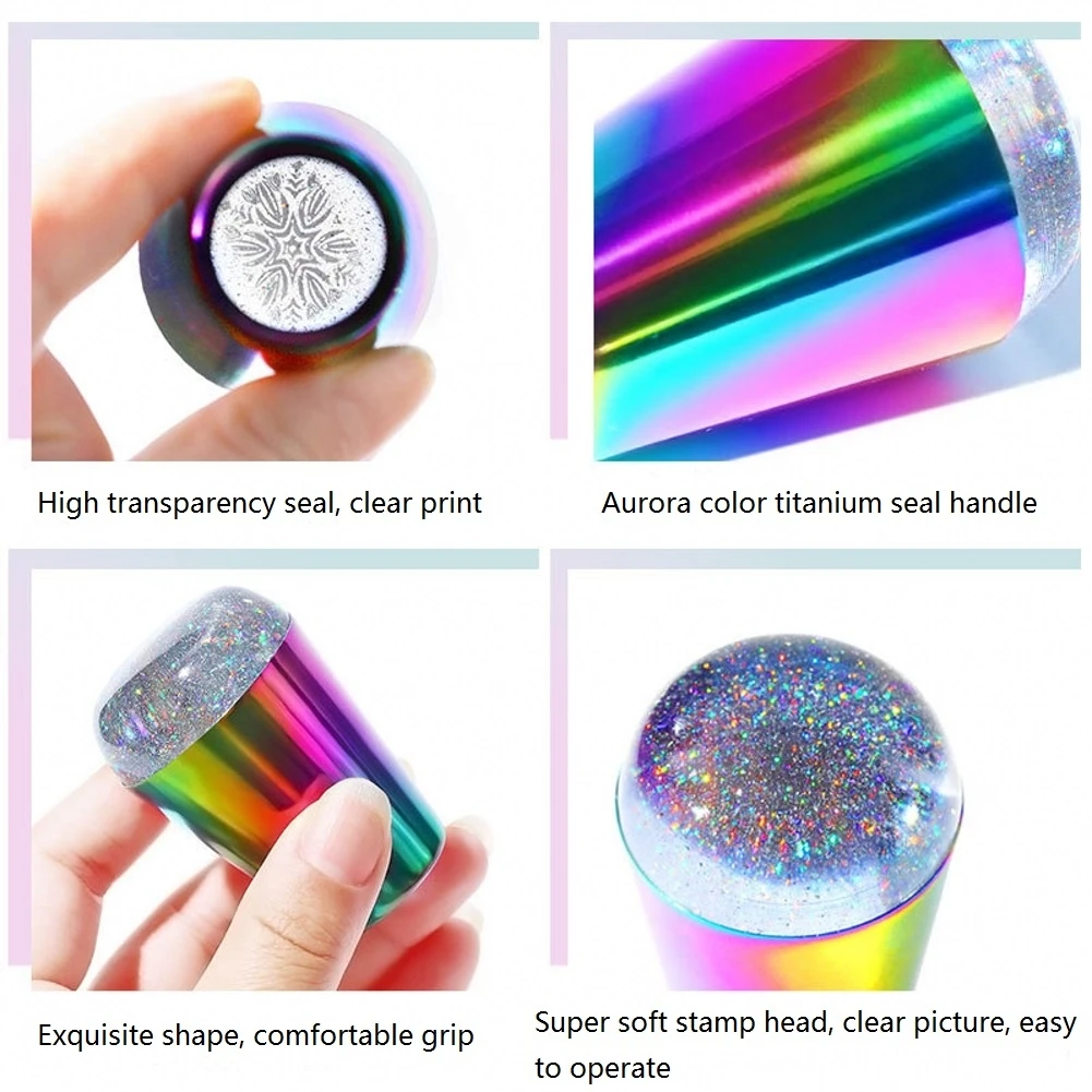 Штамп для ногтей с радужной ручкой, блестящая голографическая головка, прозрачный силиконовый штамп для пластина для стемпинга для нейл-арта, инструмент для дизайна ногтей