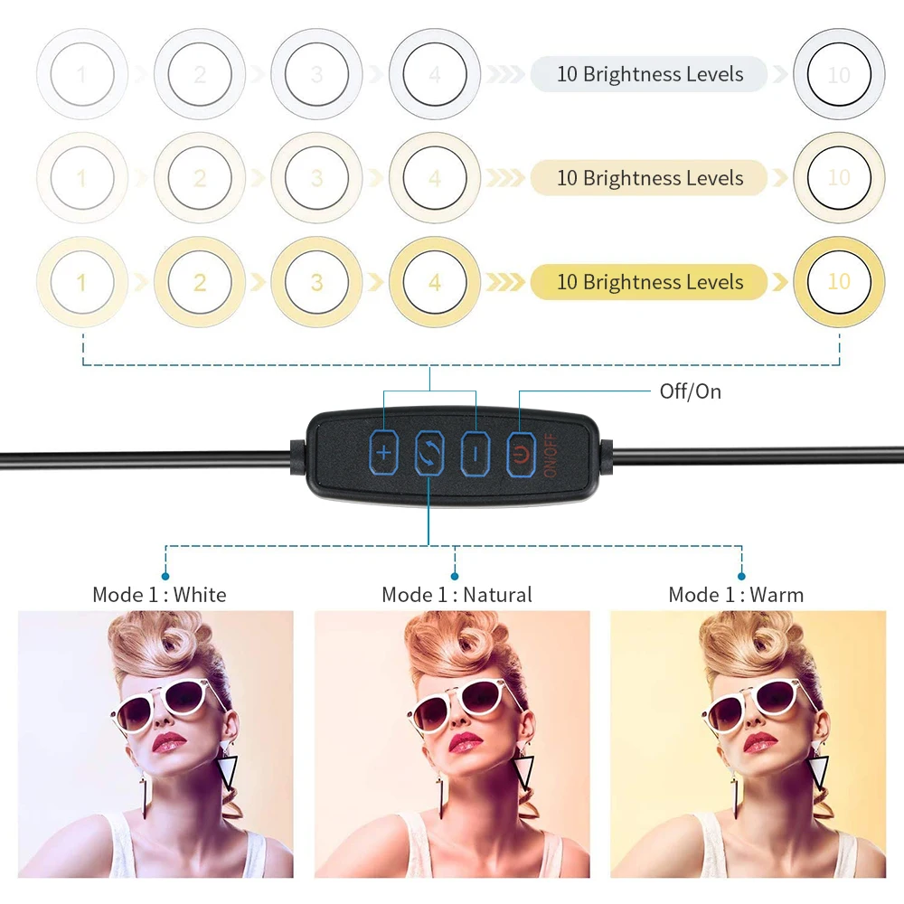 Когда вы обнаружите, что в помещении Яркость, недостаточен, вы можете включить нашей кольцевой светильник с подставкой, а также регулировать Яркость кольцевой светильник в соответствии с Крытый Защита окружающей среды, так что светильник на вашем лице может поддерживать достаточную яркость. Светильник можно регулировать до 10 уровней яркости. Если вы хотите сделать цвет более мягким, вы можете настроить цвет при трех температурах (белый, натуральный, теплый).