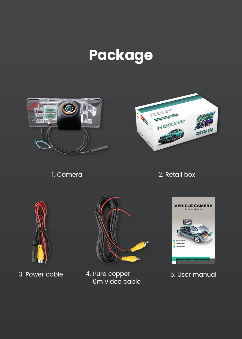 1. Камера заднего вида2. Розничная коробка3. Кабель питания4. Чистый медный 6 м видео кабель5. Руководство пользователя