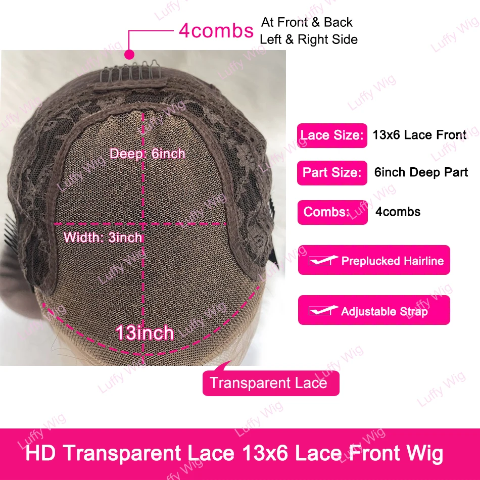 Размер Кружева: 13x6 дюймовЦвет волос: натуральный цветПлотность волос: 150% 180% 250%Размер шапки: средний размер по умолчаниюЦвет крышки: 13x6x3 прозрачное кружево и 13x6x5 средней длины коричневое кружевоДетские Волосы: Да, по всему периметруЛиния волос: предварительно выщипаннаяОтбеленные узлы: ДаПарик из искусственной кожи головы: Да, без крышкиСамое длинное соотношение волос: высокое
