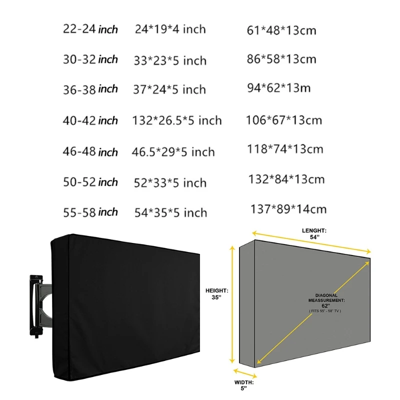 Чехол для наружного телевизора, всепогодный Универсальный защитный чехол для 22-58 дюймовOOTDTY100% новый и высокое качествоОсобенности:Независимо от того, решите ли вы поставить телевизор на патио, на открытой террасе или у бассейна, этот чехол для телевизора обеспечивает защиту всех сезонов для вашего ценного плоского телевизора.Выдерживает жесткие погодные условия, защищает ваш телевизор от пыли, насекомых, УФ-лучей, льда и конденсации.Изготовлен из ткани Оксфорд с водонепроницаемым ПВХ покрытием, позволяет ему «дышать», сохраняя при этом воду, ветер и влагу. Усиленная строчка означает, что крышка телевизора сохраняет форму.Это означает, что плесень и влажность не накапливаются под крышкой из-за изменения температуры окружающей среды или влажности. В результате ваш телевизор не поврежден и не поврежден из-за «пота».Более мягкая внутренняя подкладка и удобный карман с дистанционным управлением означает, что у вас есть идеальный чехол, чтобы ваш телевизор был защищен один год.Наш универсальный чехол подходит практически для каждого настенного крепления, совместим с ЖК-дисплеем, светодиодный, плазменный телевизорСпецификация:Материал: ткань Оксфорд22-24 дюйма Размер: approx.61x48x13cm/24x19x5in30-32 дюймов Размер: approx.86x58x13cm/33x23x5in36-38 дюймов Размер: approx.94x62x13cm/37x24x5in40-42 дюймов Размер: approx.106x67x13cm/41.73x26.4x5in46-48 дюймов Размер: approx.118x74x13cm/46,5 x29x5in50-52 дюймов Размер: approx.132x84x13cm/52x33x5in55-58 дюймов Размер: approx.137x89x14cm/54x35x5.5inЦвет: черный, как показано на фотографииКоличество: 1 шт.Примечание:Нет розничной упаковки.Возможны отклонения в 0-1 см вследствие измерений вручную. Пожалуйста, убедитесь, что вы не возражаете, прежде чем сделать ставку.Из-за разницы между различными мониторами изображение может не отражать фактический цвет изделия. Спасибо!Посылка:1 x наружная ТВ-крышка (другие аксессуары на фото не включены.)