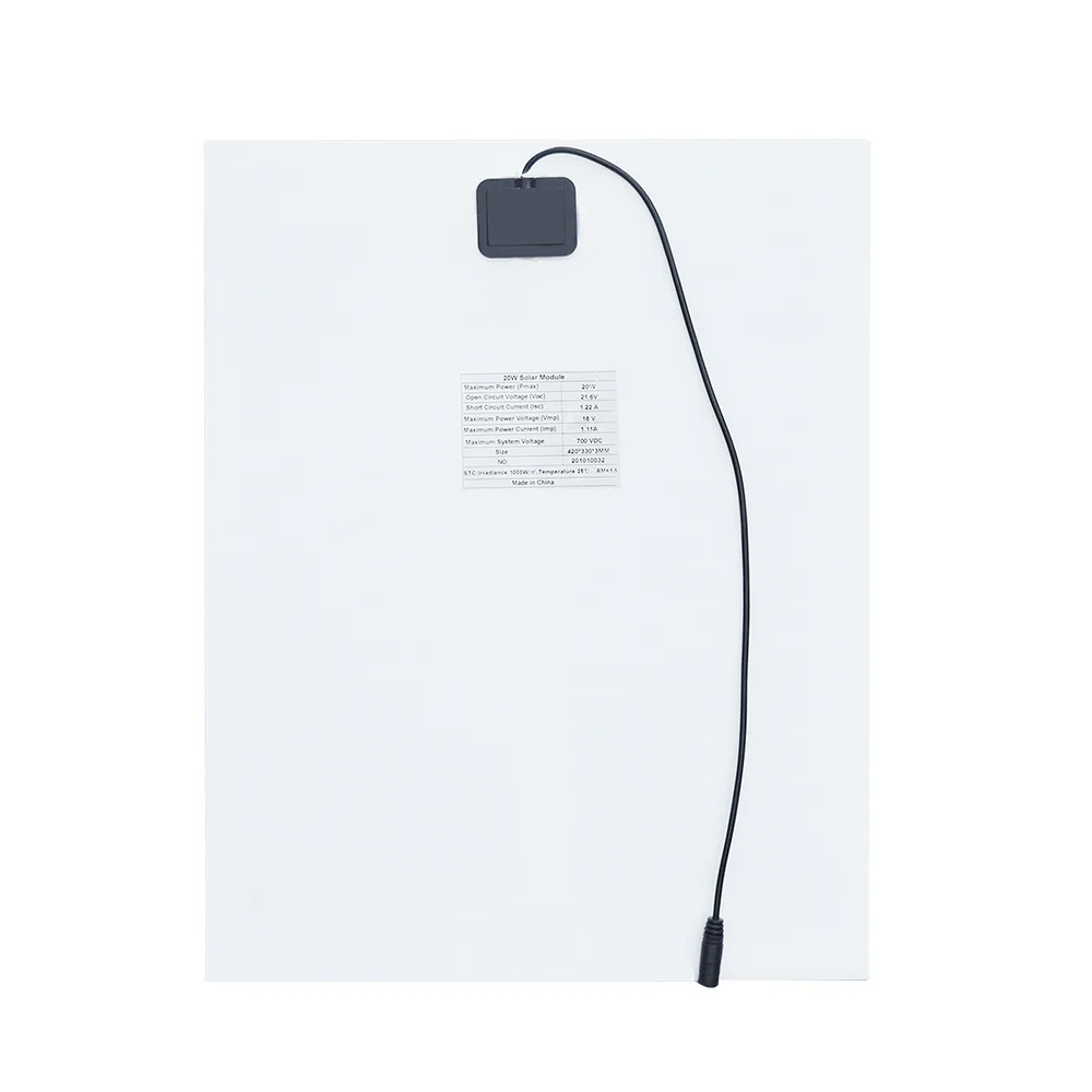 Максимальная мощность (Pmax) :20 ВтДопуск на выход: + 3%Максимальное напряжение системы: 700 В постоянного токаНапряжение открытого замыкания (Voc) : 21,6 вТок короткого замыкания (Isc) :1.22AМаксимальное напряжение питания (Vmp) : 18 вМаксимальный ток мощности (Imp) : 1.11AЭффективность ячейки: 19.5%Рабочая температура (NOCT): 45 ± 2 ℃Диапазон температур: -20 ℃ ~ + 80 ℃Количество ячеек: 36 шт.Вес: 0,4 кгРазмер: 420*330*3 ммСтандартные условия испытаний: lrradiance 1000 Вт/м2, температура 25 ℃,AM = 1,5