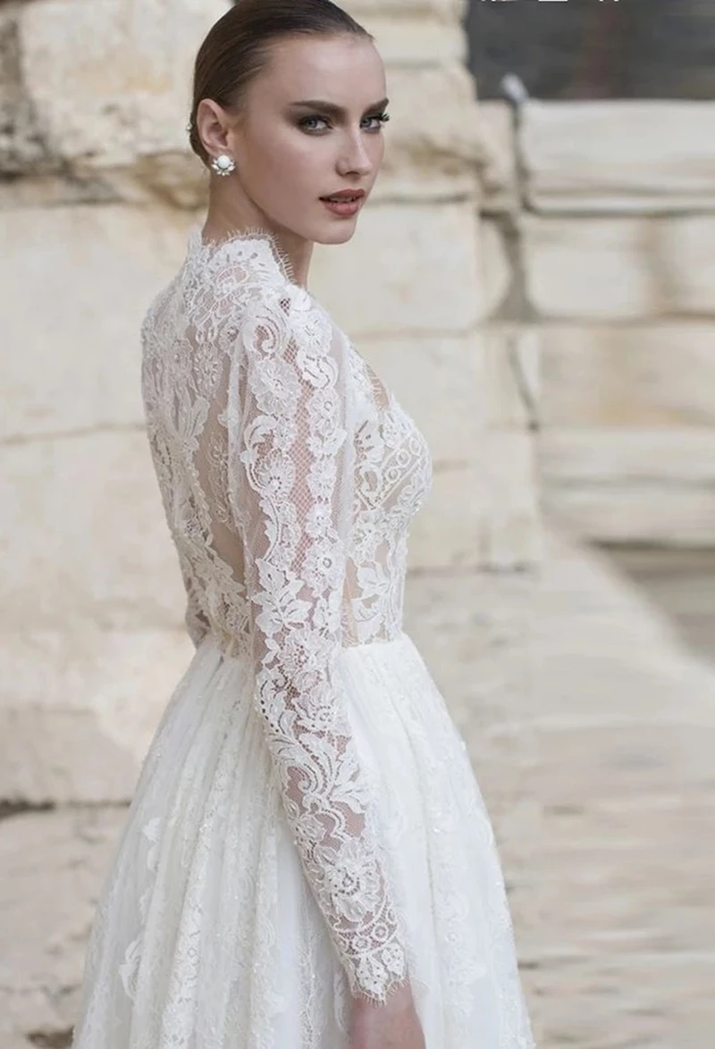 Кружевное короткое свадебное платье с длинным рукавом, ТРАПЕЦИЕВИДНОЕ Элегантное Вечерние для невесты, с квадратным воротником, на заказ, 2021