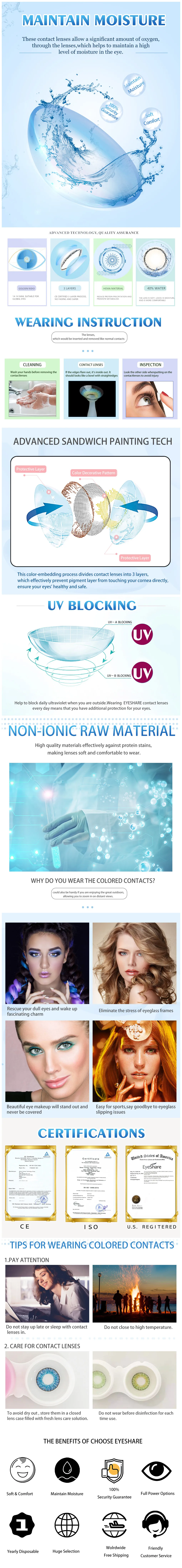 Как ухаживать за контактными линзами?1. Очистите и дезинфицируйте линзу умеренным раствором (Вымойте руки, поместите контактные линзы в ладонь. Намочите линзы несколькими каплями раствора для ухода и аккуратно протрите линзы пальцем. Конечно, вы можете использовать машину для очистки контактных линз).2. Используйте свежее решение для ухода каждый раз и удаляйте чехол с объектива после каждого использования.3. Не забудьте регулярно менять решение, если вы не носите объектив часто.4. Очищайте линзу через краску каждые 2-3 дня, чтобы эффективно предотвратить выпадение белка.5. Держите линзы подальше от острых предметов, потому что линзы очень тонкие и уязвимые.6. Держите линзы в сухом месте и Избегайте прямых солнечных лучей.