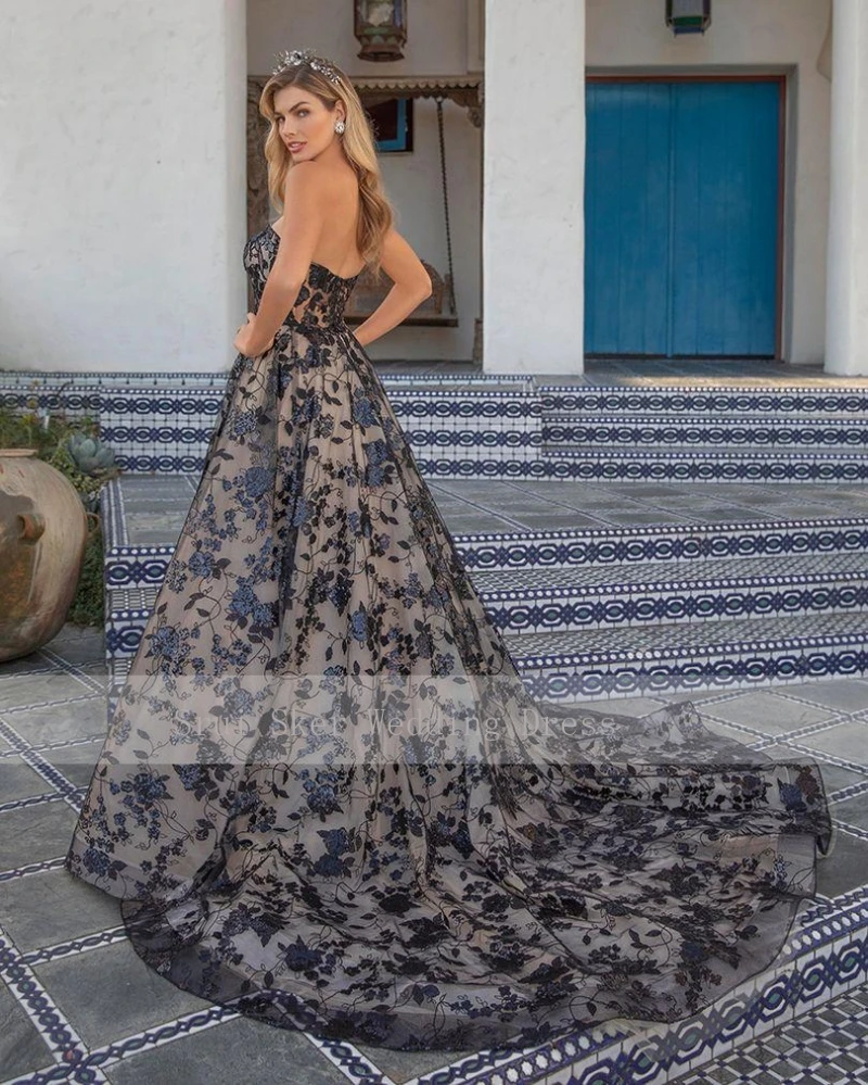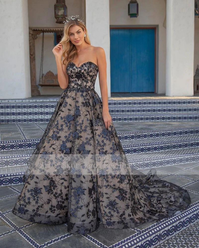 Женское свадебное платье со шлейфом, черное кружевное ТРАПЕЦИЕВИДНОЕ ПЛАТЬЕ с открытыми плечами, платье невесты, 2021