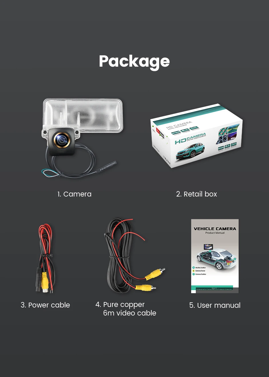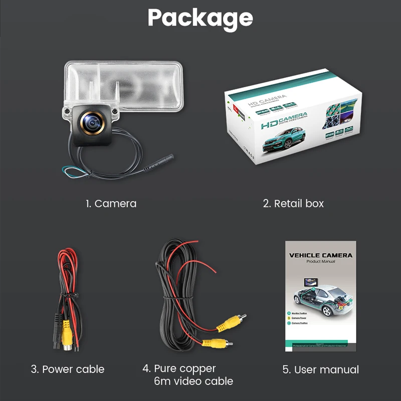 1. Камера заднего вида2. Розничная коробка3. Кабель питания4. Чистый медный 6 м видео кабель5. Руководство пользователя
