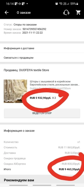 ребятушки, дорогие , не покупайте у этого продавца, это мошенник ! я заказала два комплекта штор, всё обговорили в личных сообщениях я сделала заказ , на 11 тысяч , 5932 (со скидкой) один комплект и тут же заказываю 2й , продавец отправляет 2 посылки , эти посылки приходят в разное время , но не суть, в одной посылке штора , в другой тюль я начала ему писать где комплект , а он мол вы заказали только 1, если хотите ещё комплект, заказывайте и всё пропал, месяц ,пока шёл спор,он мне не ответил ни на одно сообщение! еле еле доказала команде али что я 2 комплекта заказала, вернули 5100 вместо 5932, но ничего не советую у него ничего брать таких проблем у меня небыло никогда