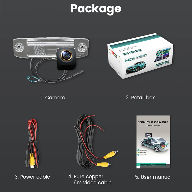 1. Камера заднего вида2. Розничная коробка3. Кабель питания4. Чистый медный 6 м видео кабель5. Руководство пользователя
