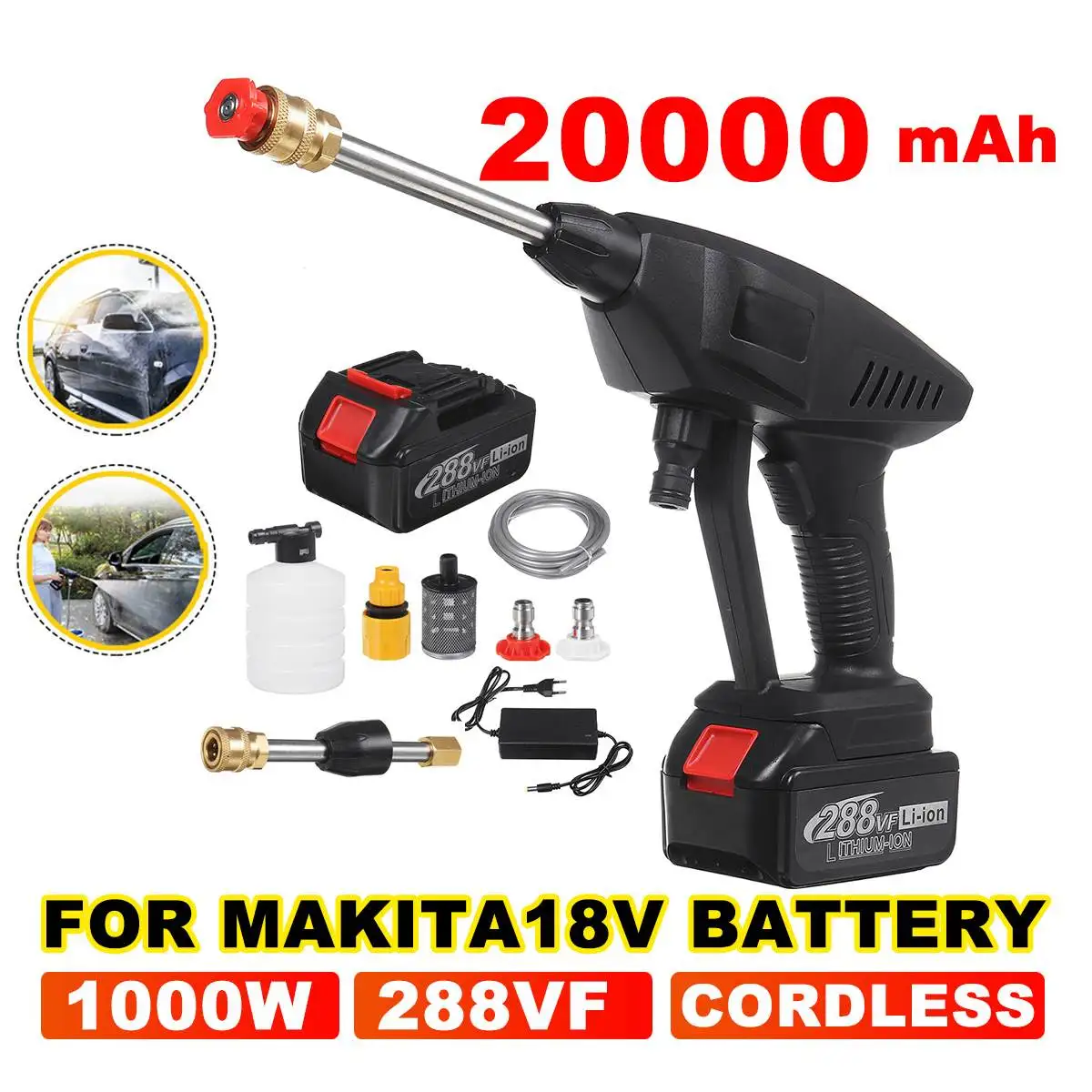 Мойка Автомобильная 288VF, 1000 Вт, 30 бар, Беспроводная портативная мойка высокого давления, водяной пистолет, пеногенератор для батареи Makita