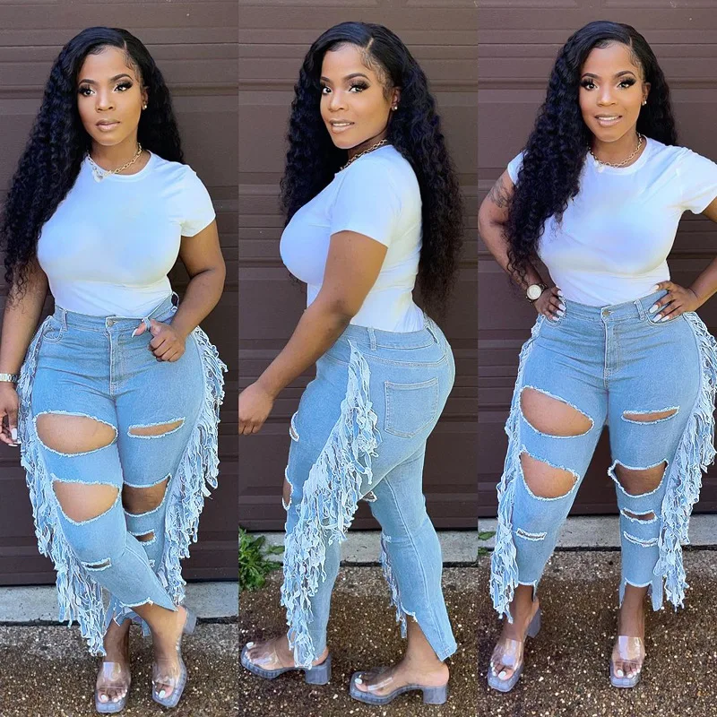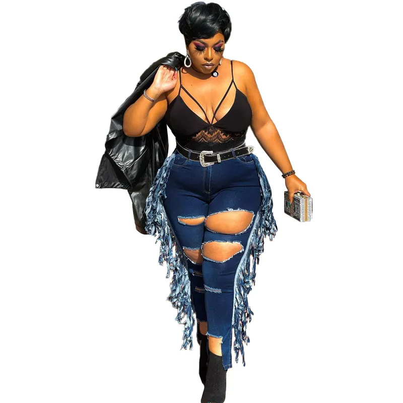 Женские джинсовые брюки, уличная одежда, эластичные лосины с бахром...