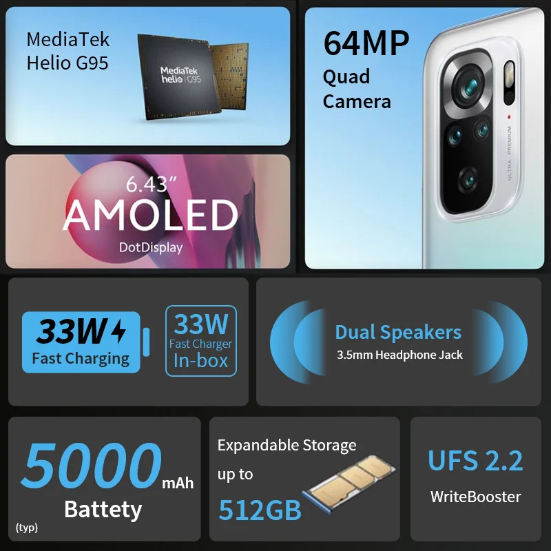 64-мегапиксельная четырехъядерная камера, 6,43 "AMOLED DotDisplay, Helio G95ЦП ------------ Восьмиядерный процессор MTK Helio G95, до 2,05 ГГцЭкран --------- 6,43 дюйма 2400x1080P FHD + AMOLED DotDisplayОЗУ + ROM----6GB + 64 Гб/6 ГБ + 128 ГБ/8 ГБ + 128 ГБКамера -------- 64 мп + 8 Мп + 2 Мп + 2 МП четырехъядерная задняя камера, передняя камера 13 МПАккумулятор --------- 5000 мАч (тип), поддержка быстрой зарядки 33 Вт, зарядное устройство в коробке 33 ВтOS-------------MIUI 12,5, MIUI Global, Поддержка Google Play, многоязычное и OTA обновлениеДругое ---------- Wi-Fi, Bluetooth 5,0, GPS, Распознавание отпечатков пальцев, разблокировка лица AI, разъем для наушников 3,5 ммПосылка: Redmi Note 10S/адаптер/кабель USB Type-C/Инструмент для извлечения SIM-карты/защитный чехол/Руководство пользователя/гарантийный талонСеть:Полный Netcom, две SIM-карты с двойным режимом ожидания (слот для Nano SIM-карты x 2 + слот для SD-карты x 1)4G: LTE FDD B1/2/3/4/5/7/8/20/284G: LTE TDD B38/40/41(2535-2655 МГц)3G: WCDMA B1/2/4/5/82G: GSM 850 900 1800 1900 МГц
