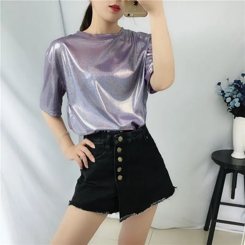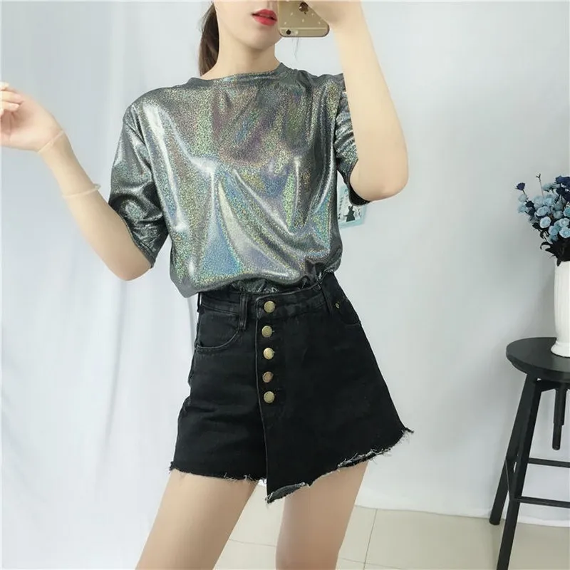 Летняя женская футболка, блестящий Сияющий светоотражающий металлик...