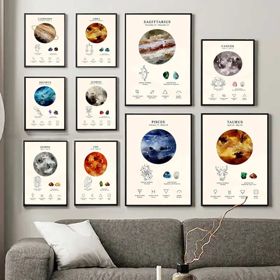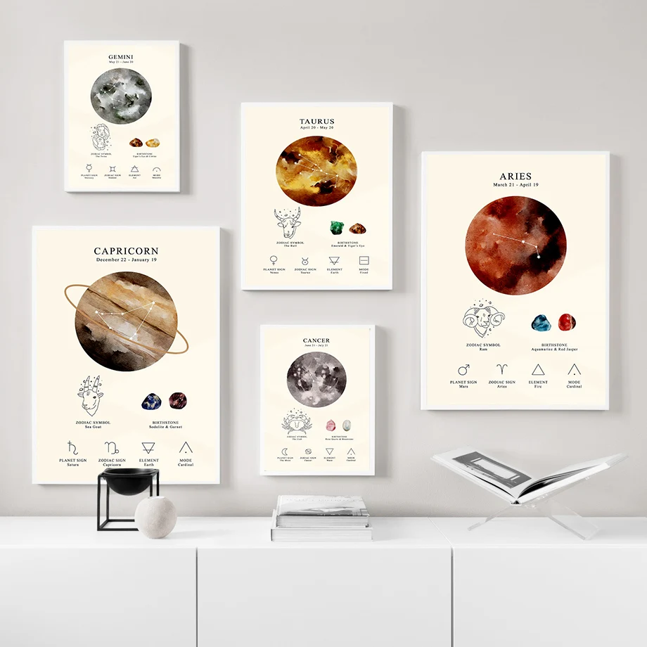 Картина на холсте, с созвездием камня рожденья, символом зодиака, плакатами и принтами для детской комнаты, домашний декор