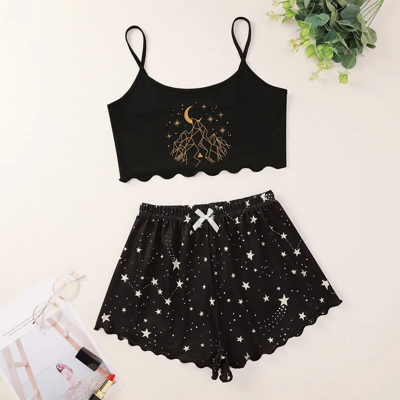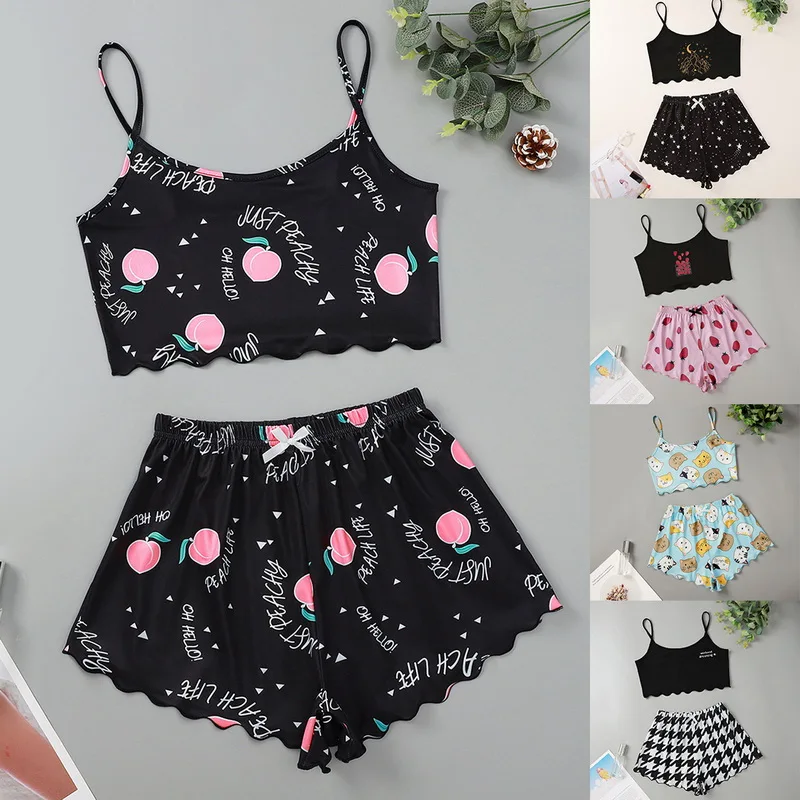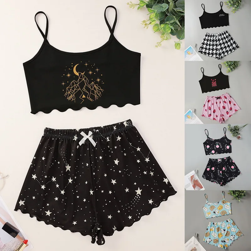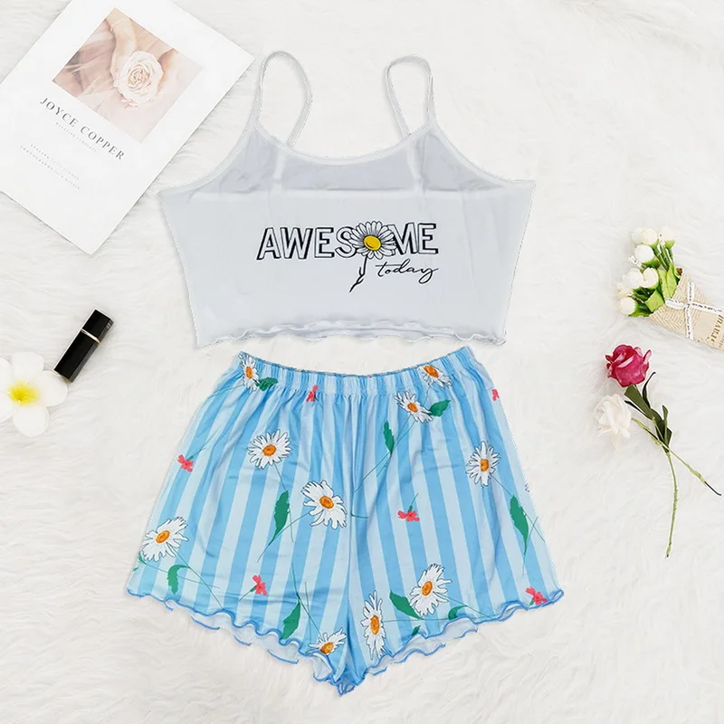 Пижамный комплект на бретелях-спагетти с буквенным принтом, пижама без рукавов с отделкой, комплект с шортами для сна, костюм для сна, одежда для сна, Женская пикантная ночная рубашка