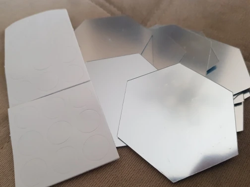 Отличные небольшие зеркальца, двусторонний скотч в наборе. Плёнка сверху не дала им поцарапаться.