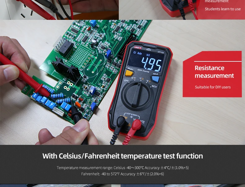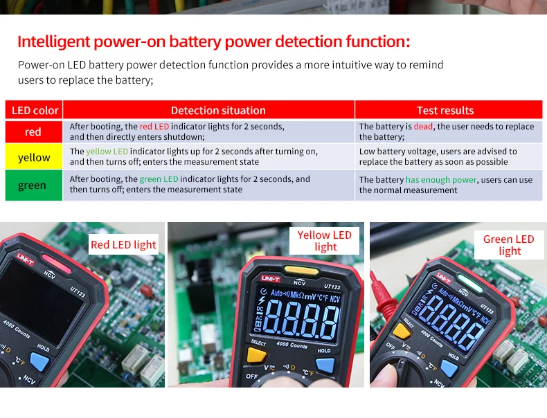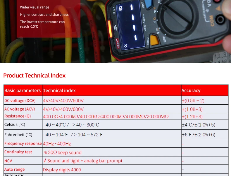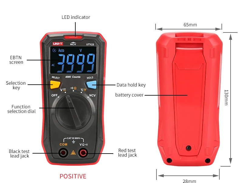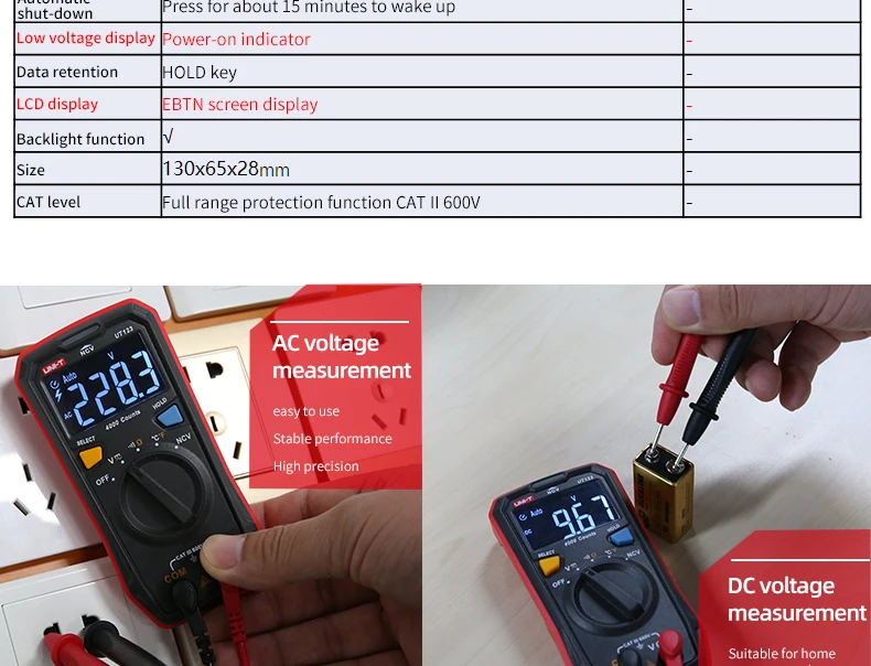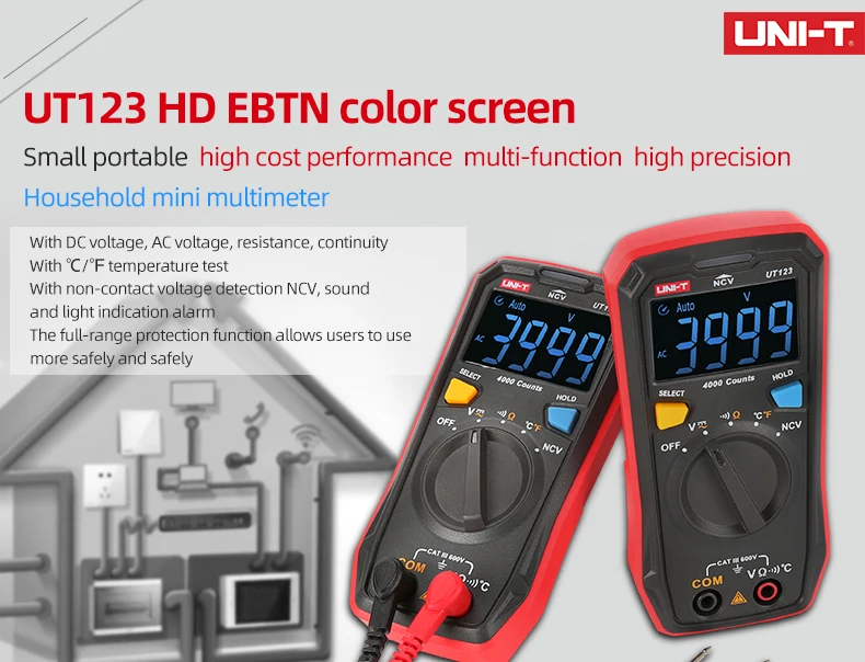 UT123-это Карманный жилой мультиметр, предназначенный для домашнего использования. Компактная конструкция позволяет легко держать его в одной руке, а экран EBTN позволяет пользователям получать четкие показания под максимальным углом, он также отлично подходит для работы в темноте.