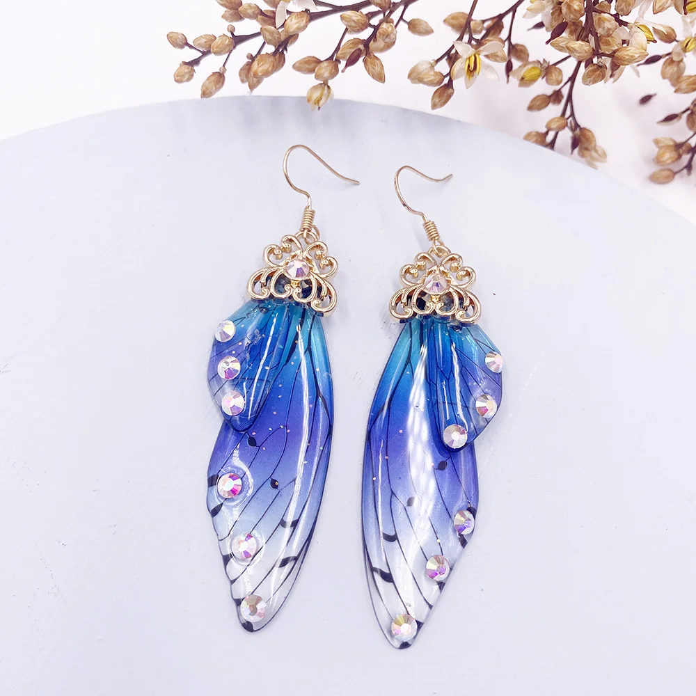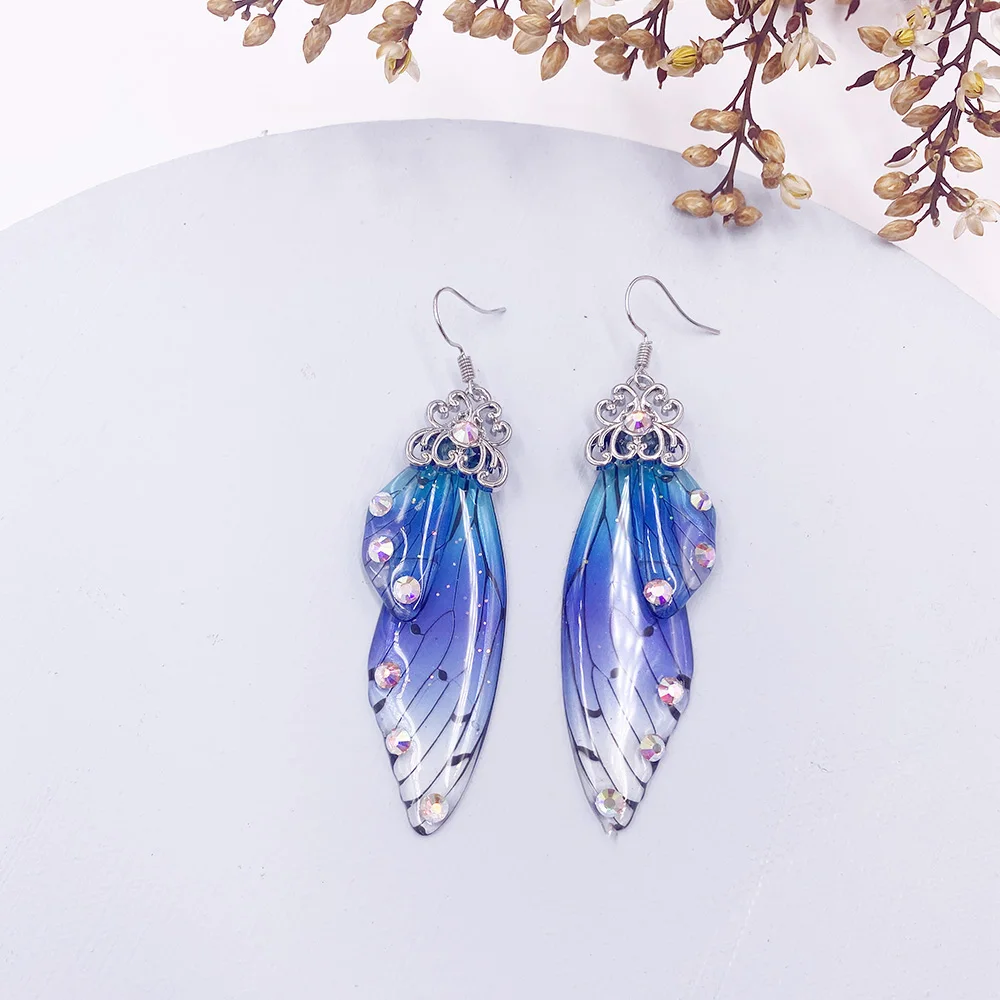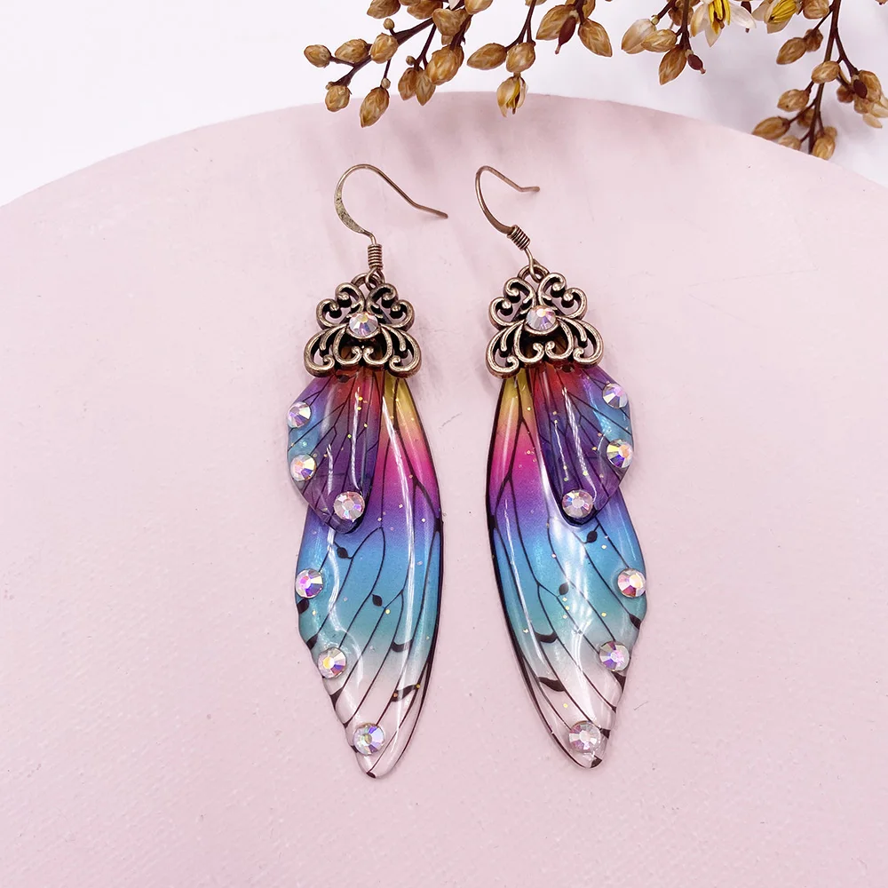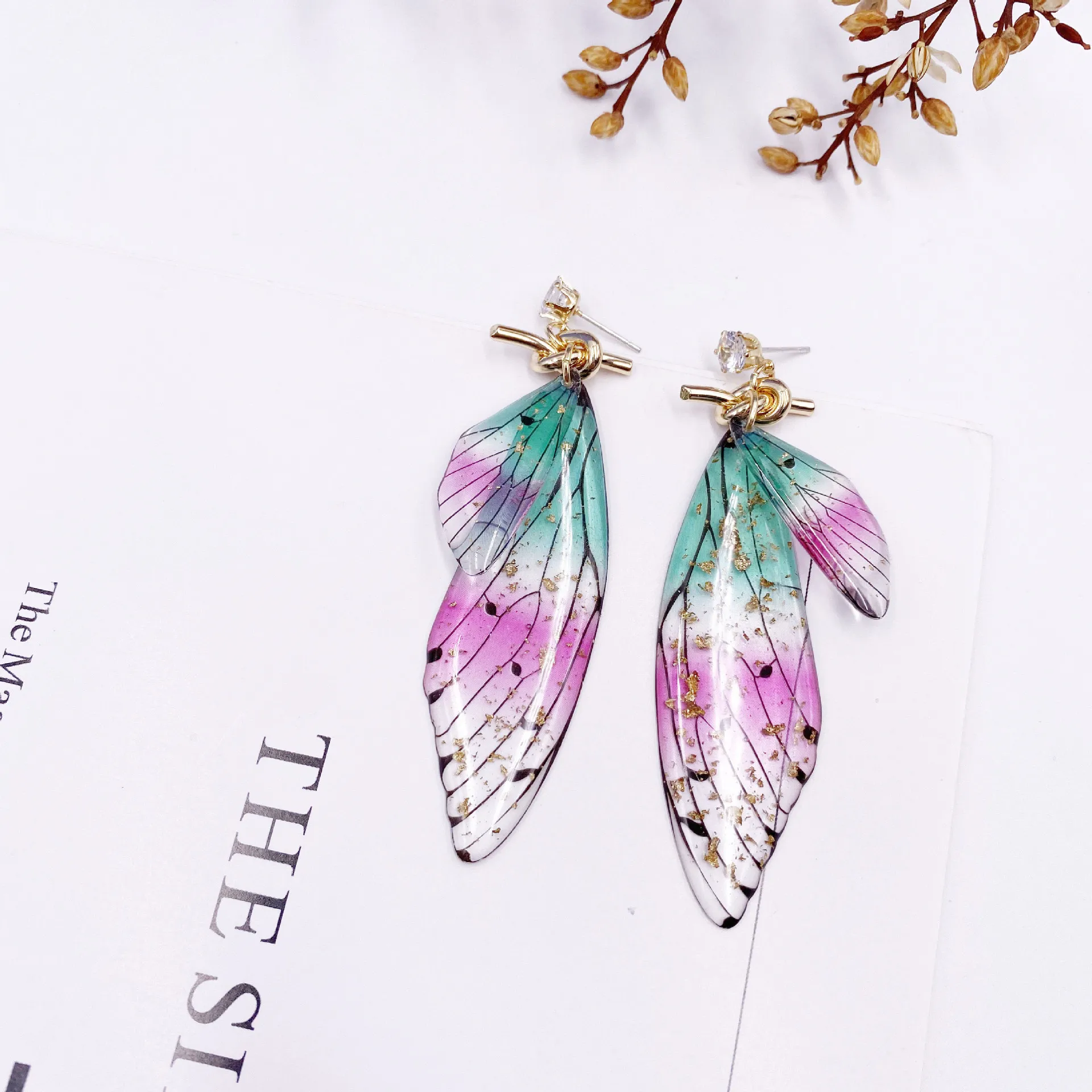 Серьги неоновые в стиле Минар с изображением крыльев цикады, модные длинные висячие серьги с бабочкой и градиентом из розовой и синей фольги