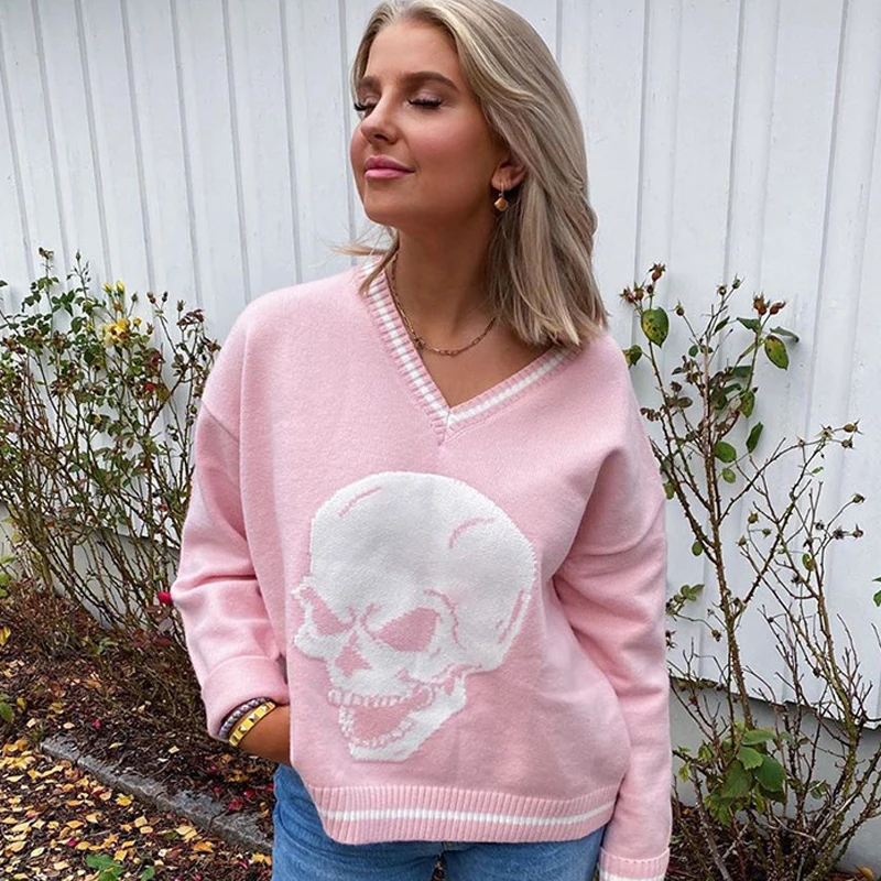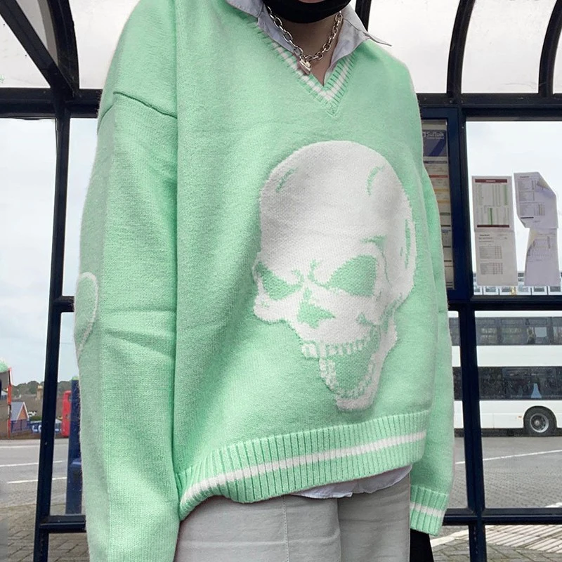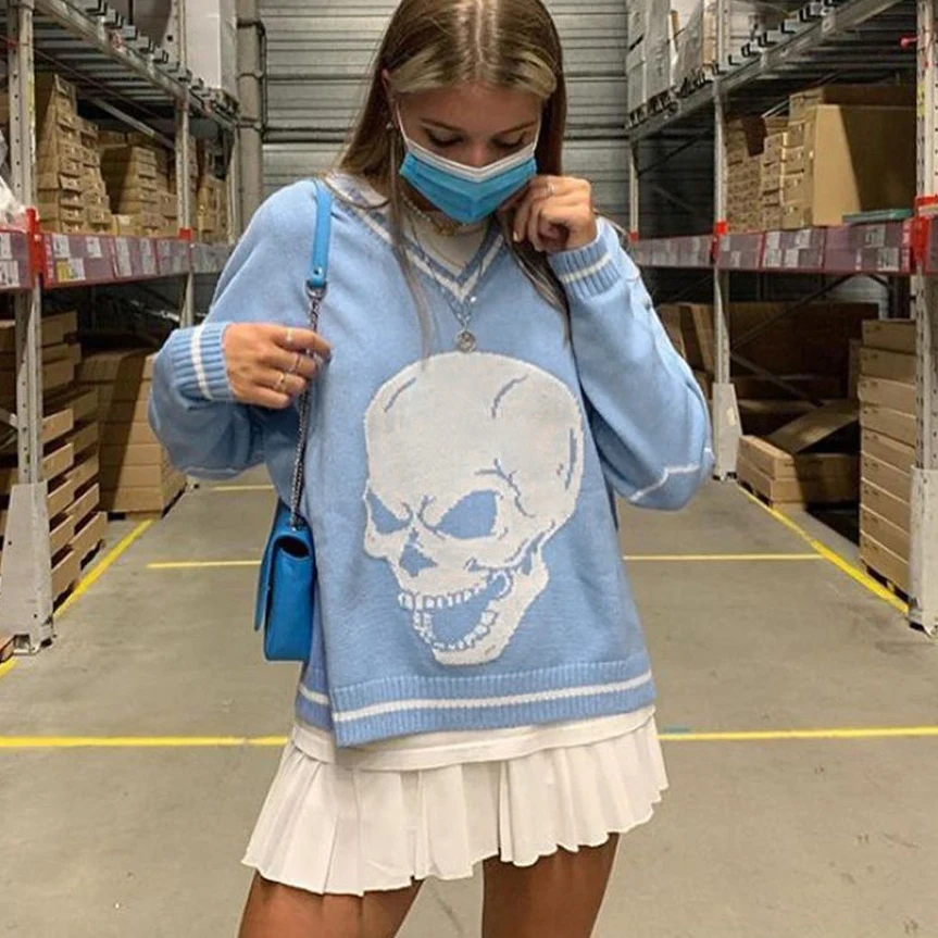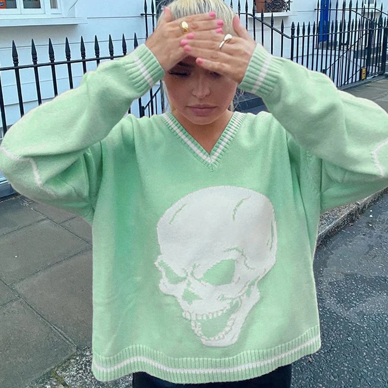 Женский свитер в стиле гранж y2k, мягкая вязаная блузка с принтом черепа, зимний уличный свитер с длинным рукавом и V-образным вырезом, винтажные Топы оверсайз