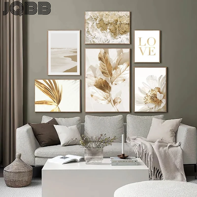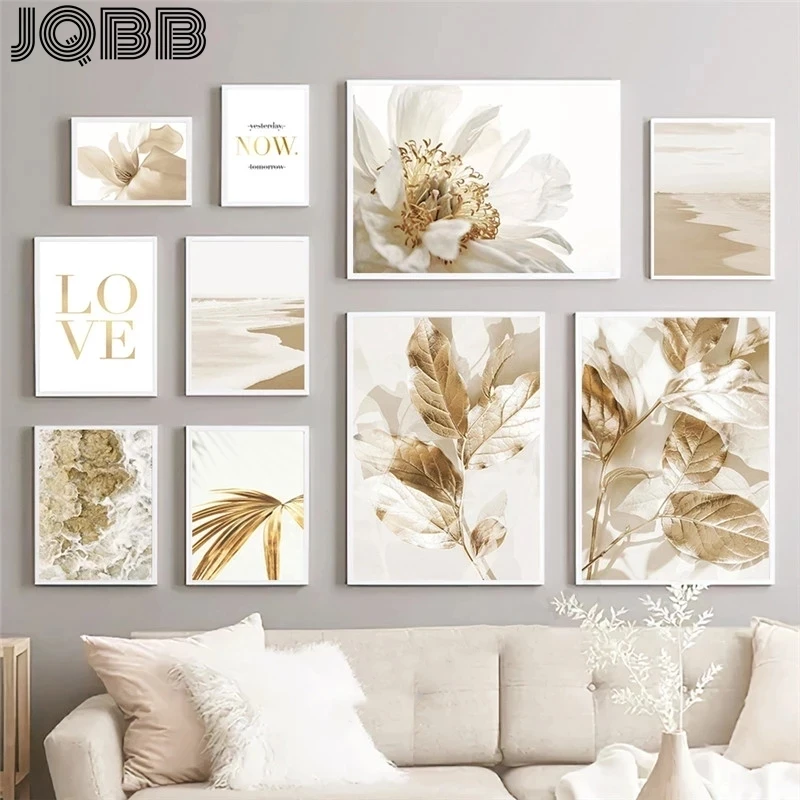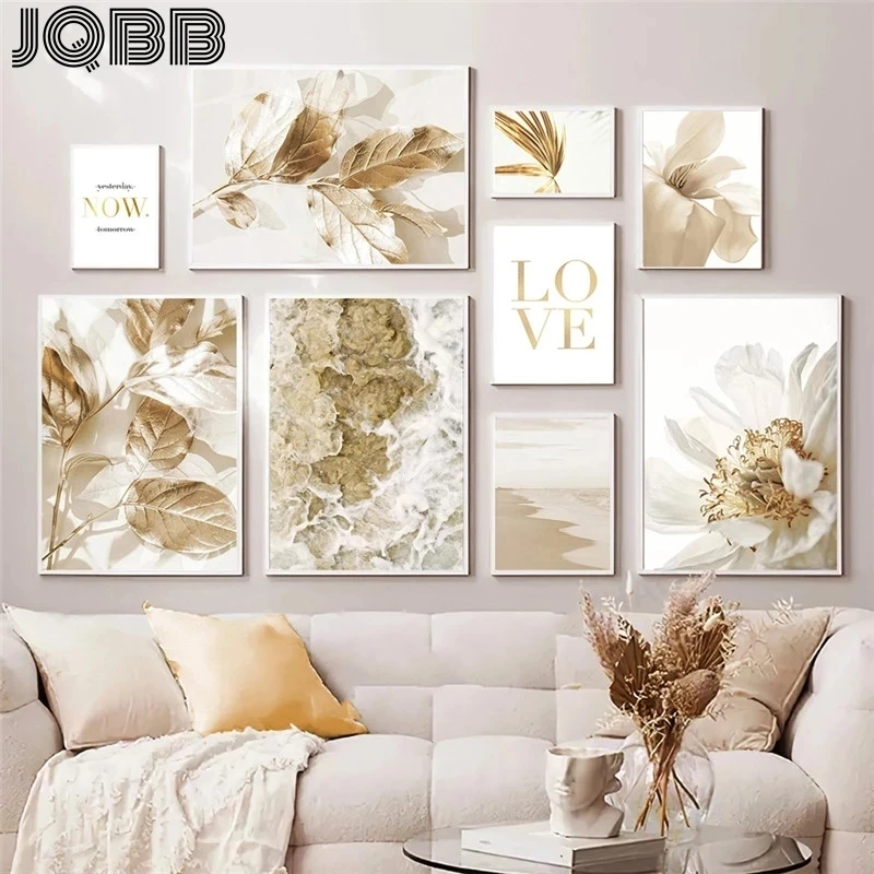 Картина на холсте с изображением золотых цветов и листьев, Настенная картина в скандинавском стиле, Пляжный Пейзаж, Современный домашний декор, плакат и печать, декор для гостиной