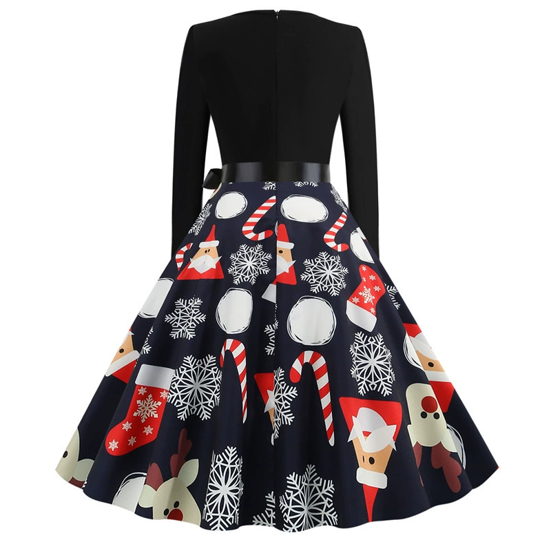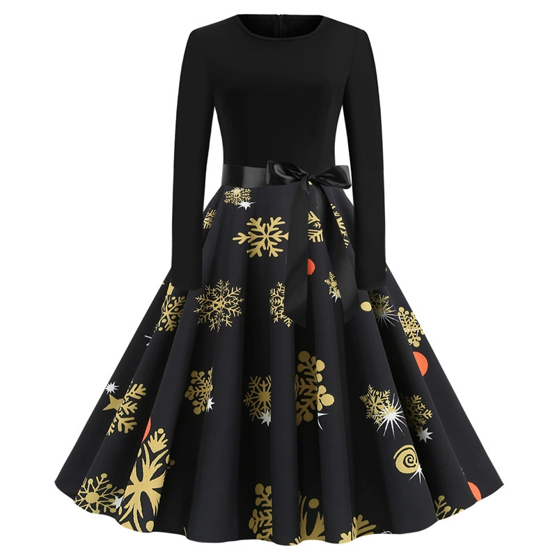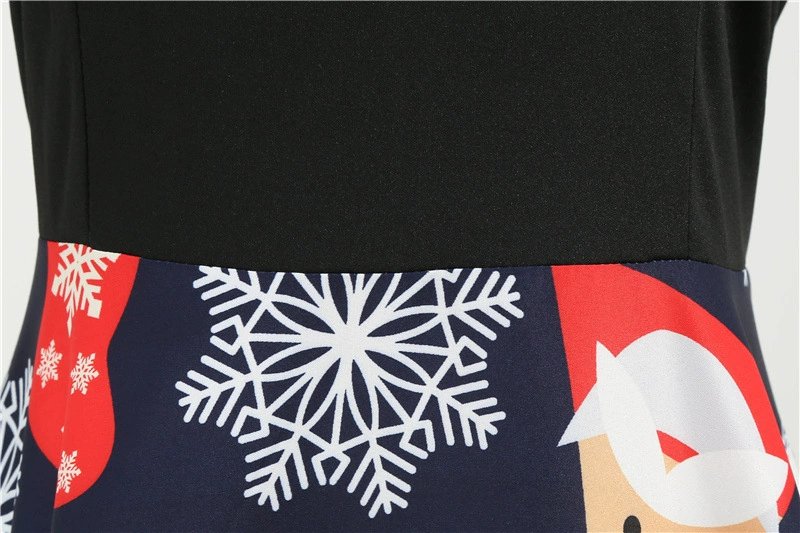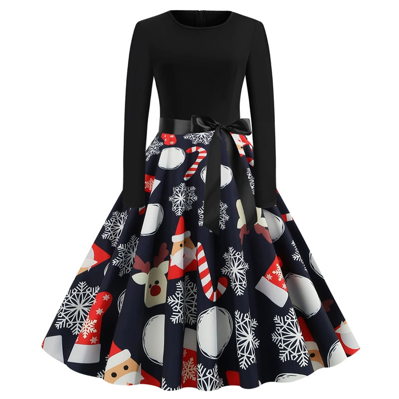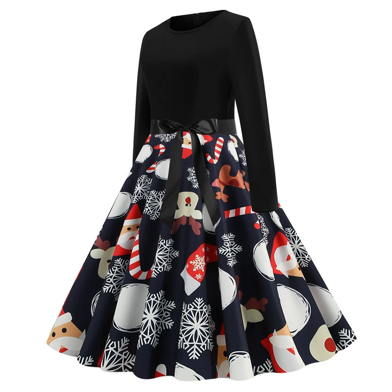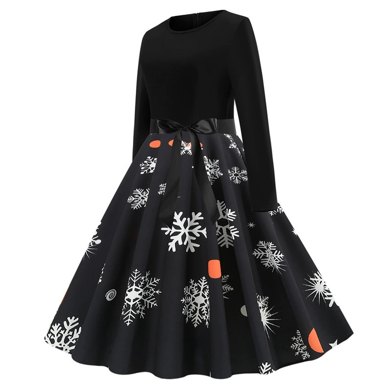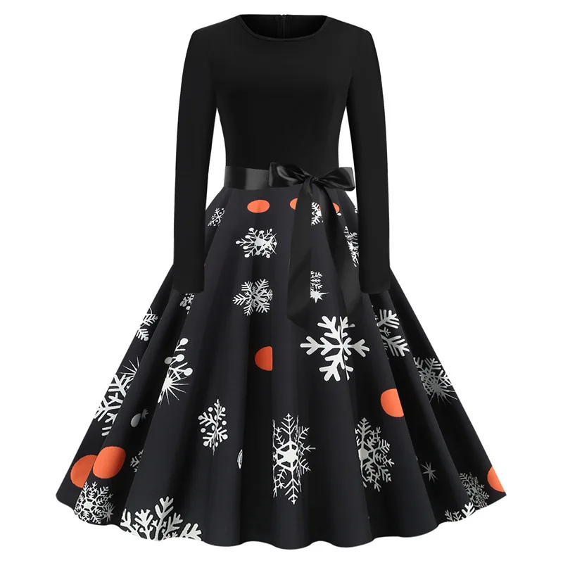 Женское платье с длинным рукавом junxi WAN, Черное вечернее платье с круглым вырезом, с длинными рукавами, с рождественским принтом, зима 2019