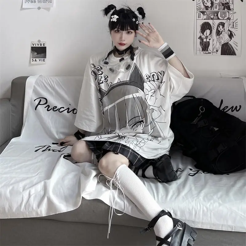 Женская футболка с коротким рукавом, летняя белая футболка большого размера с японским двухмерным аниме принтом для девушек, корейские топы для студентов, 2022