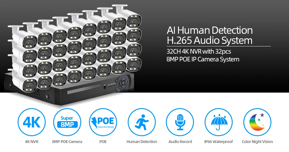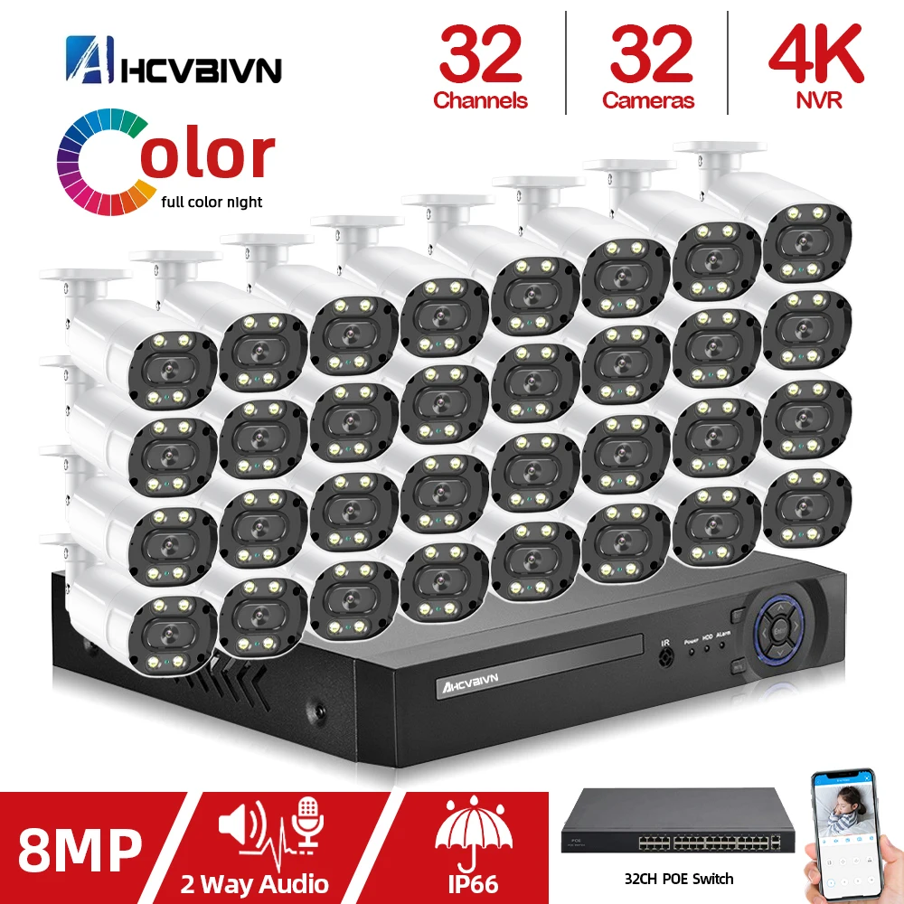 Наружная цветная камера ночного видения, двустороннее аудио, POE IP-камера 8 Мп, комплект H.265 + 32 канала, 4K NVR, внутренняя система видеонаблюдения HD 8 МП