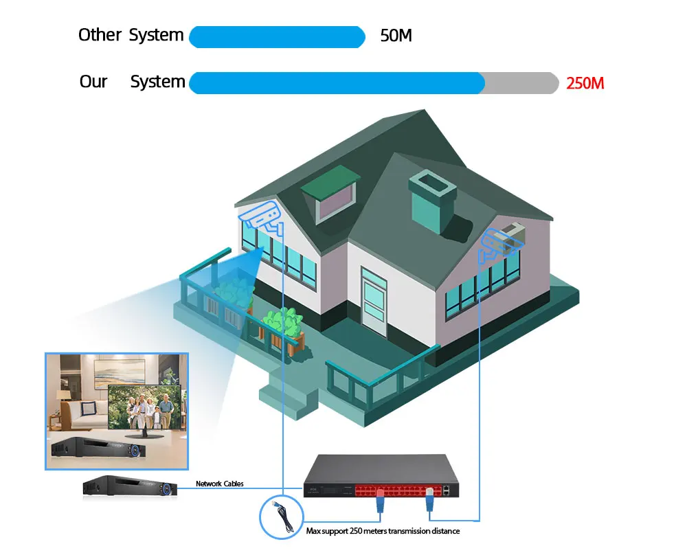 POE Система Максимальная поддержка 250 м POE кабели расстояние передачи, что значительно увеличивает удобство домашней установки.