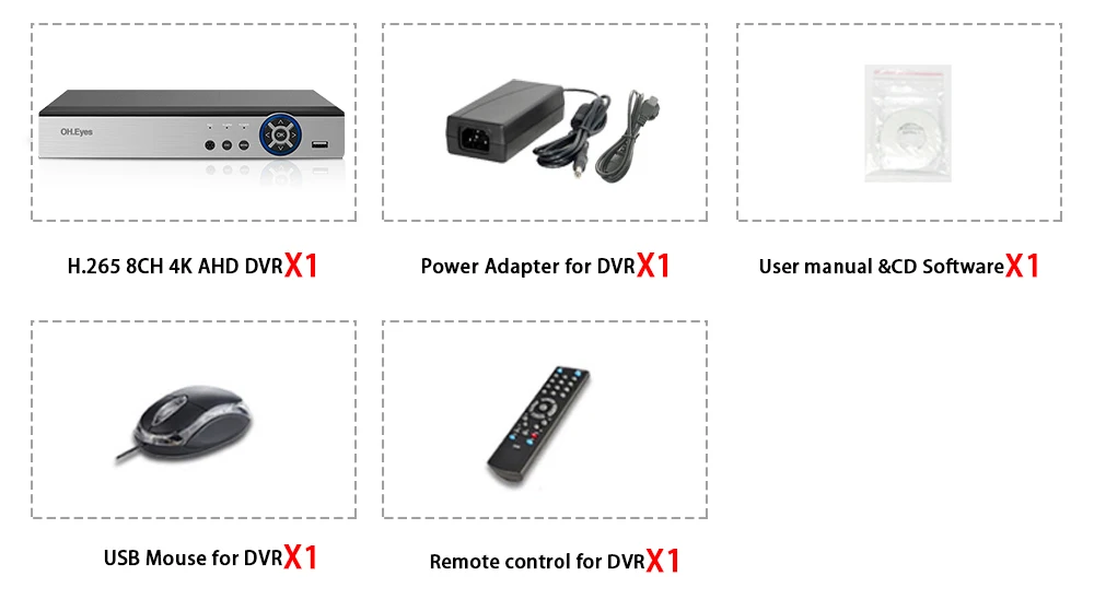 1 гибридный цифровой видеорегистратор H.265 8CH 4K 6 в 1 AHD DVR;1 блок питания для DVR;1 USB-мышь для DVR;1 компакт-диск с программным обеспечением для DVR;1 х пульт дистанционного управления для DVR;
