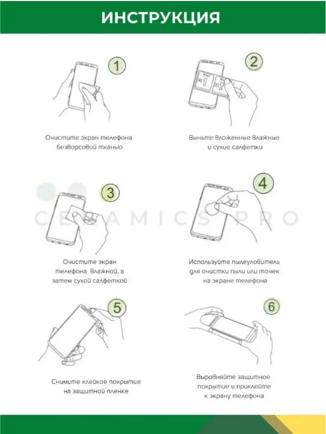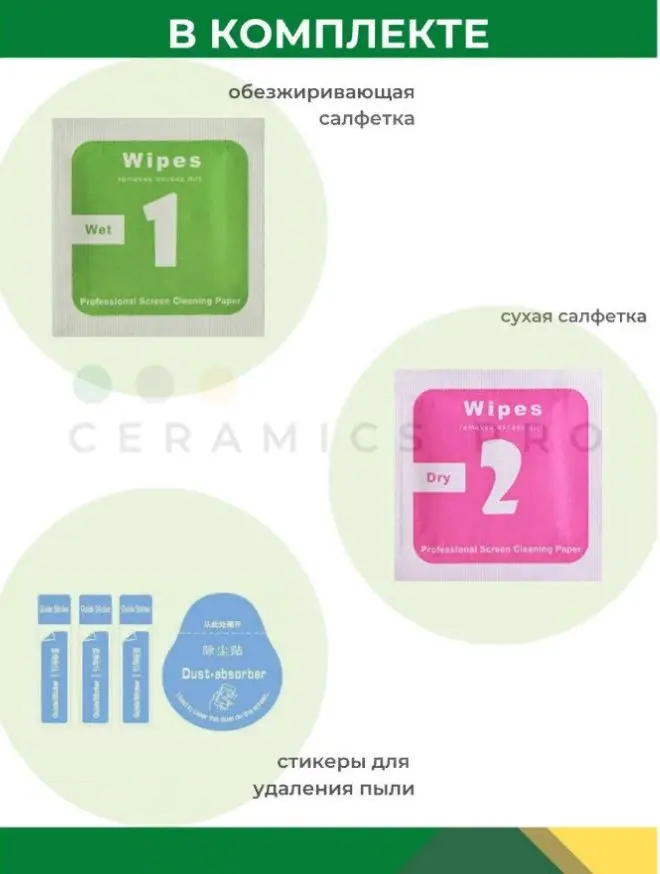 1) Очистите дисплей с помощью спиртовой салфетки. Убедитесь в том, что экран чист от пыли, грязи и отпечатков пальцев.2) Протрите насухо дисплей второй салфеткой.