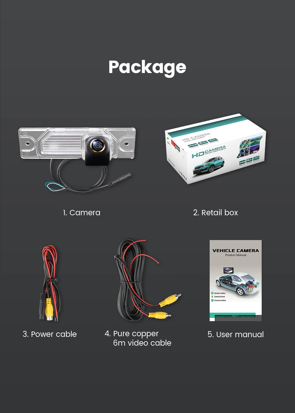 1. Камера заднего вида2. Розничная коробка3. Кабель питания4. Чистый медный 6 м видео кабель5. Руководство пользователя