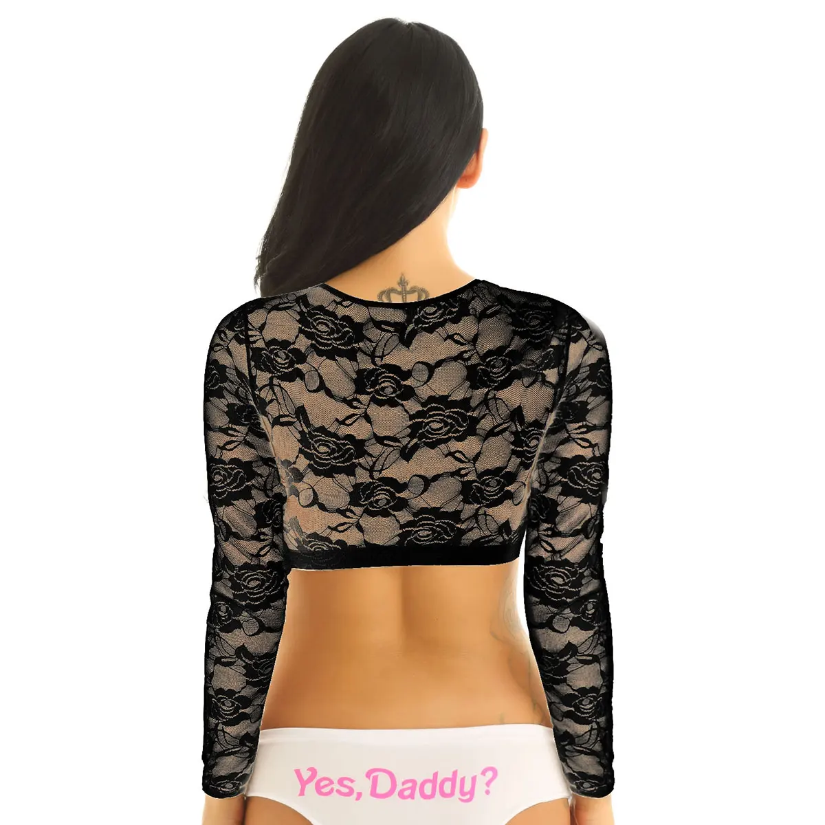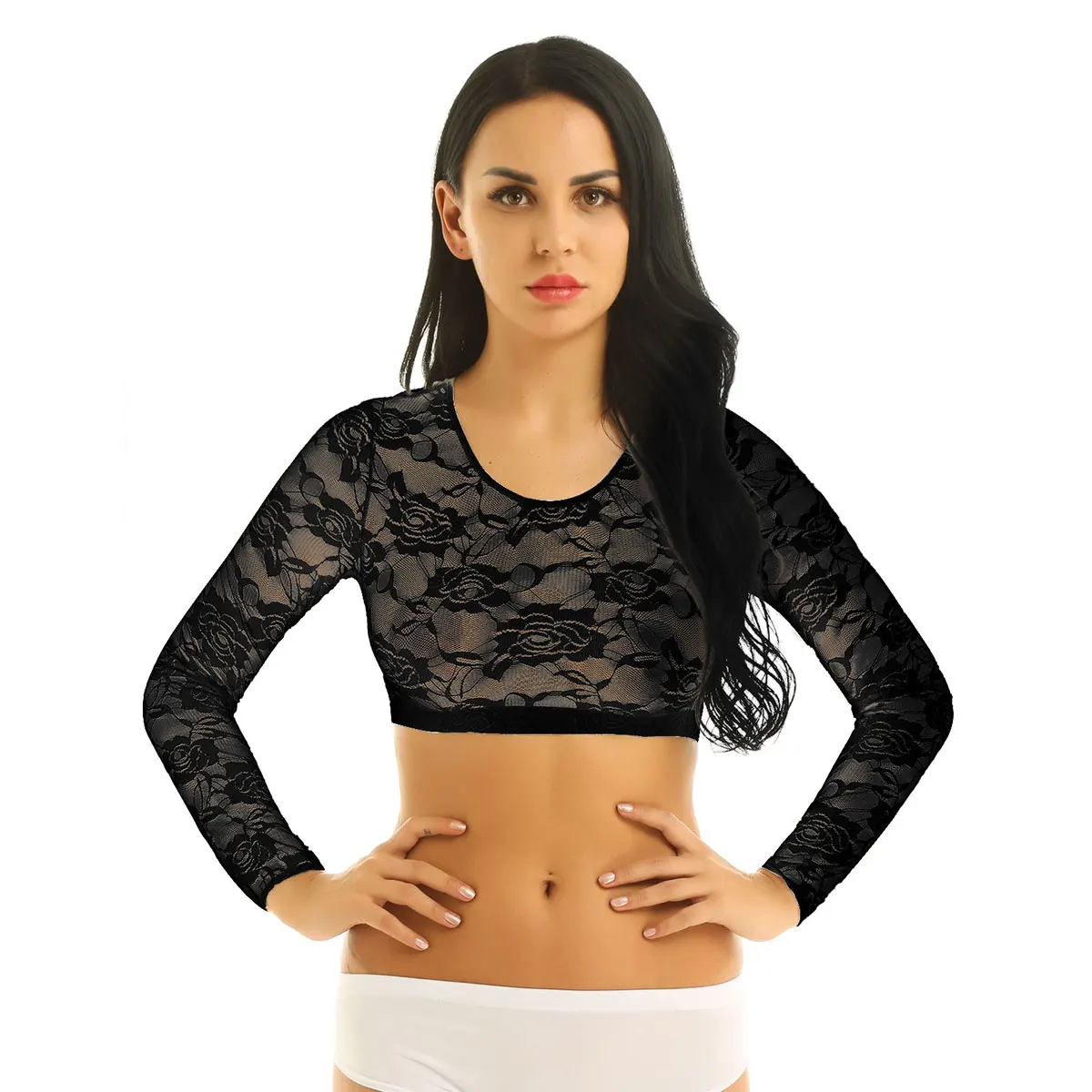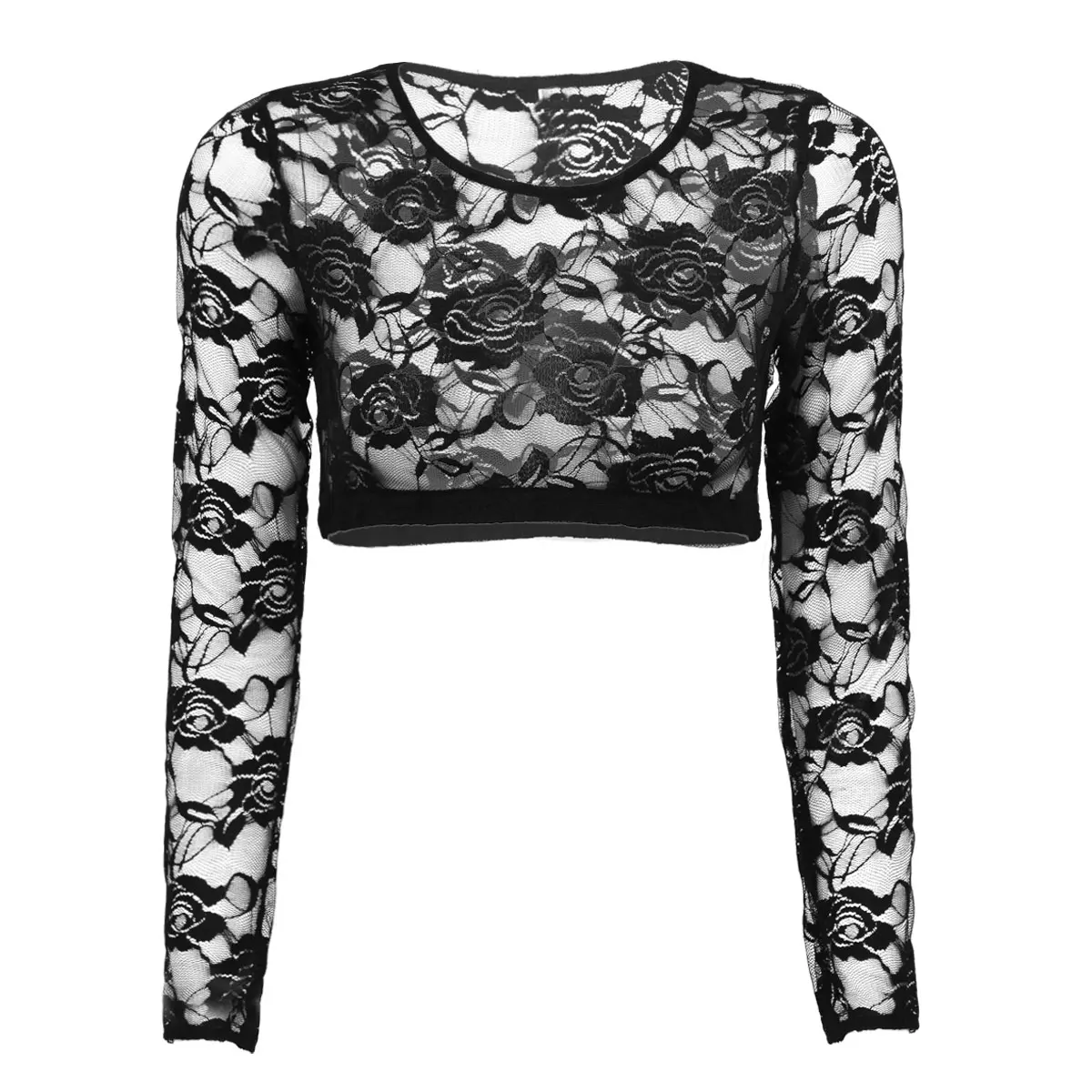 Женская одеждаСексуальныйУкороченный топ с длинными рукавами; Прозрачная короткая блузка с цветочным узоромКруглый вырезМягкие кружевные вечерние топы на бретельках