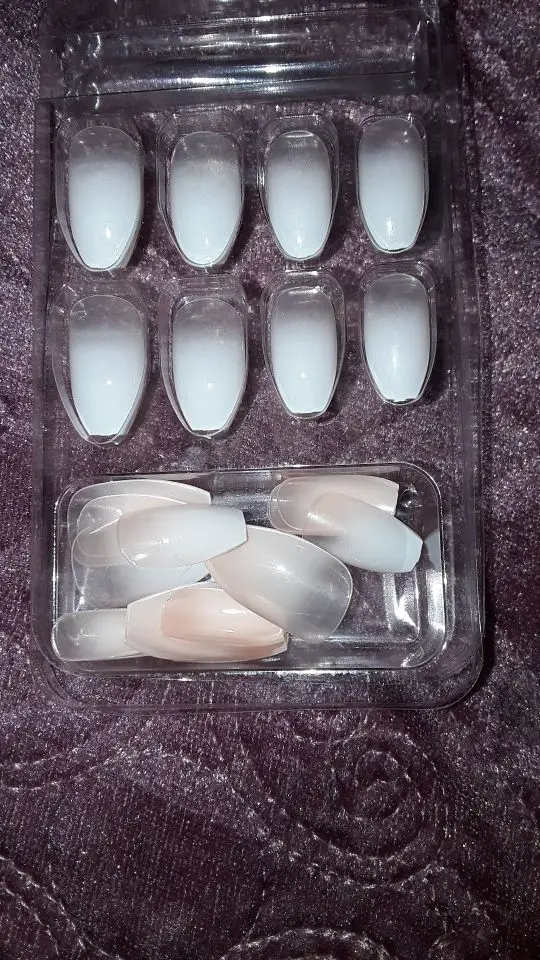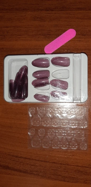Ногти полностью совпали по цвету.(фото получилось затемненным) В упаковке немного перемешались и повыпадали из ячеек. В наборе шли наклейки-клей. Сама упаковка не очень надежна(в руках чуть всё не рассыпалось на пол), поэтому открывать лучше за столом. Подтверждения закаца и отправки пришлось ждать долговато. Доставкатоже заняла приличнре время. По-этому будьте готовы подождать.