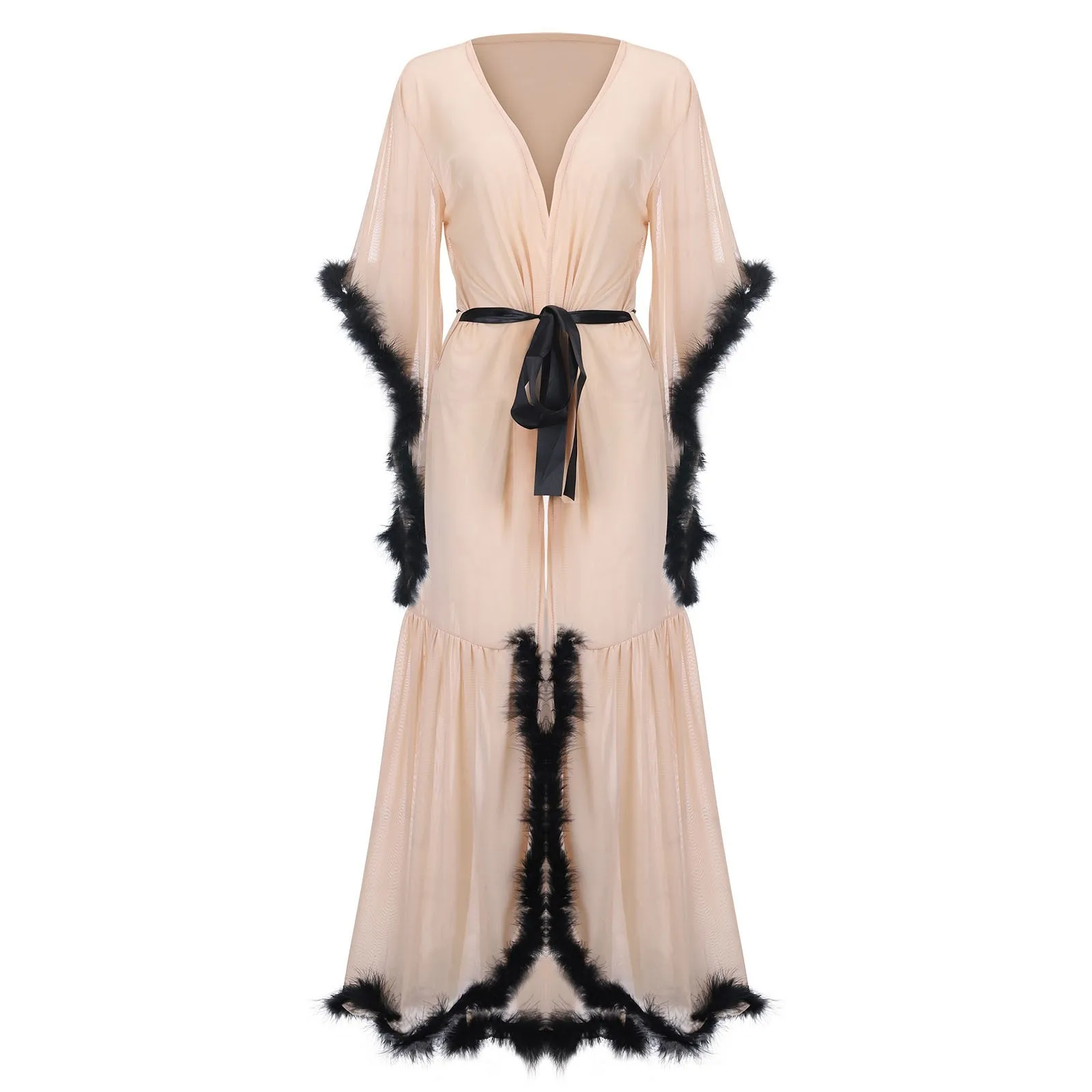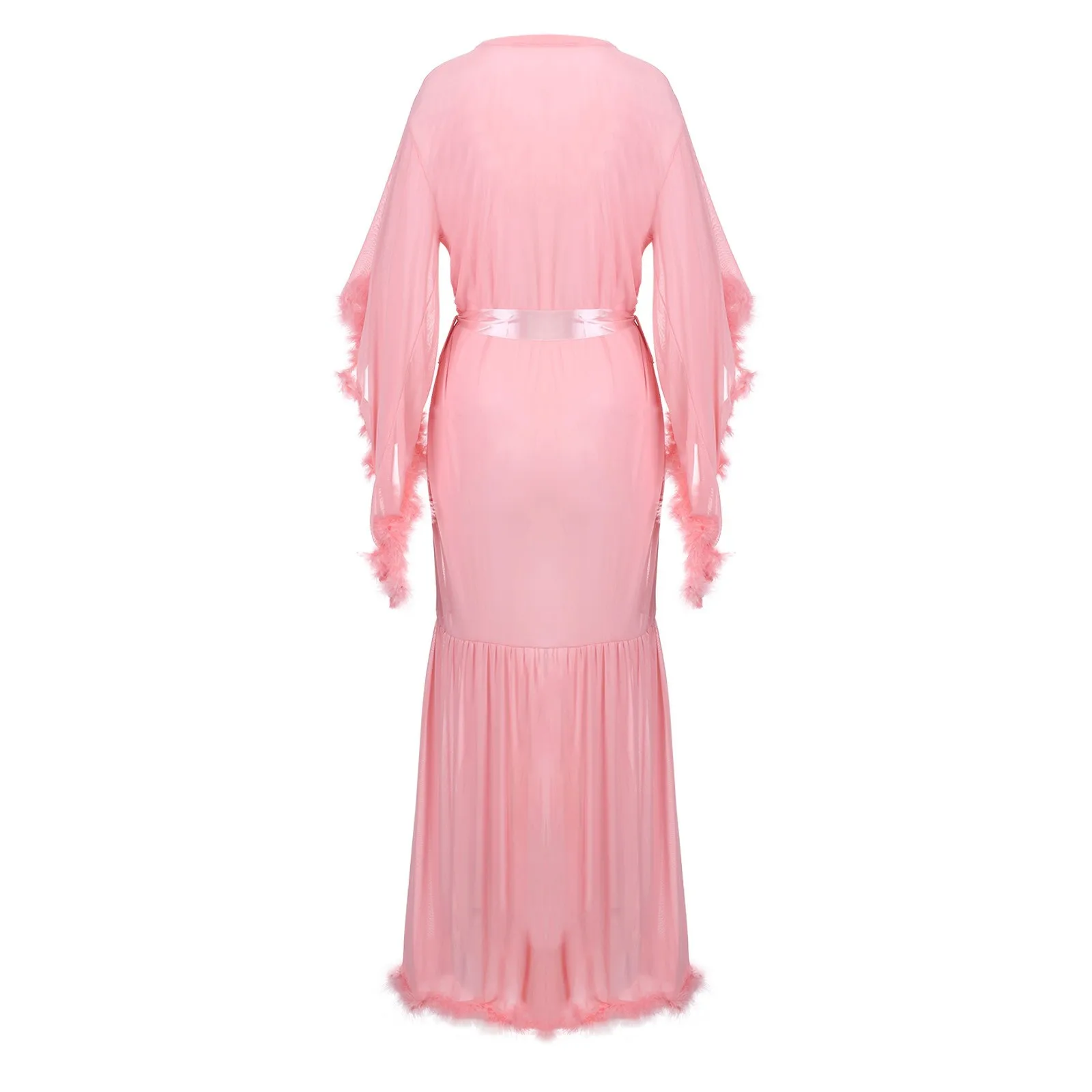 Женское платье-макси с расклешенным рукавом, прозрачное платье большого размера с перьями и Расклешенным рукавом