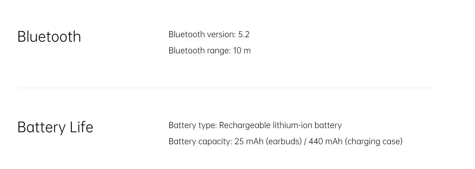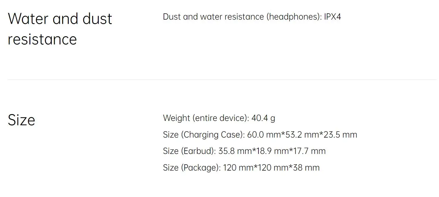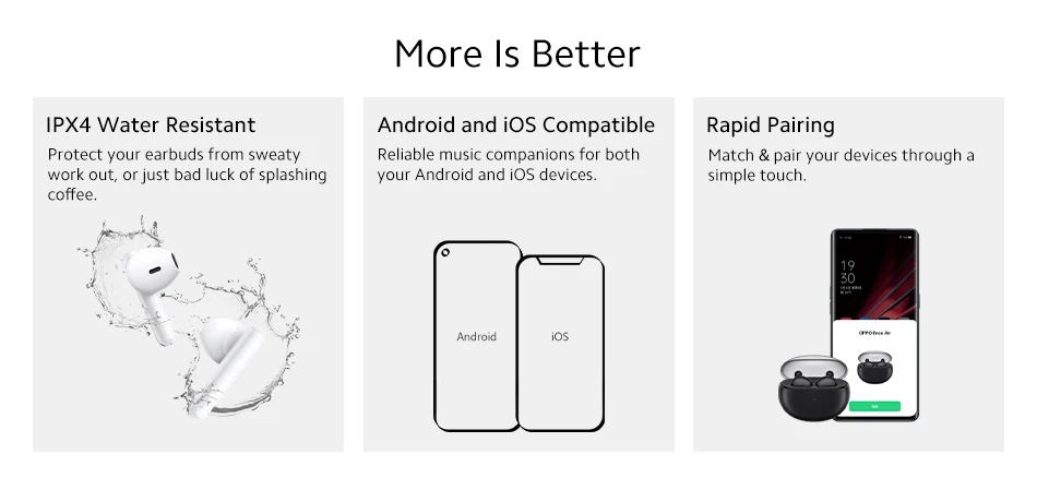Водонепроницаемость и защита от пыли: IPX4Кодеки: AAC SBCДрайвер: 12 мм Динамический драйверЧувствительность драйвера: 112 ± 1 дБ при 1 кГцЧастотный диапазон отклика: 20 Гц-20 кГцЧувствительность микрофона: -38 дБВ/ПаВерсия Bluetooth: 5,2Диапазон Bluetooth: 10 мТип батареи: литий-ионный аккумуляторЕмкость аккумулятора: 25 мАч (наушники) / 440 мАч (зарядный чехол)Время воспроизведения музыки (50% громкости): 4 часа (одного заряда) / 24 часа в сутки (с зарядным чехол)Время зарядки: 1,5 ч (наушники)/1,5 h (наушники + зарядное устройство чехол)Порт зарядки: Type-CВес (всего устройства): 40,4 гРазмеры (заряжающий чехол): 60,0 мм * 53,2 мм * 23,5 ммРазмер (вкладыши): 35,8 мм * 18,9 мм * 17,7 ммРазмер (посылка): 120 мм * 120 мм * 38 мм* Вышеуказанные спецификации были получены на основе испытаний, выполненных в лабораториях OPPO. Время зарядки было протестировано в лабораториях OPPO при температуре 25 °C с помощью стандартного зарядного устройства OPPO. Фактические результаты могут незначительно отличаться в зависимости от экологических факторов и используемого зарядного устройства.
