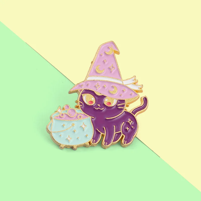 Серия на Хэллоуин Фиолетовый волшебный кот ведьмы сплав эмалированная брошь мультфильм милое волшебное зелье маленький значки с животными ювелирный подарок