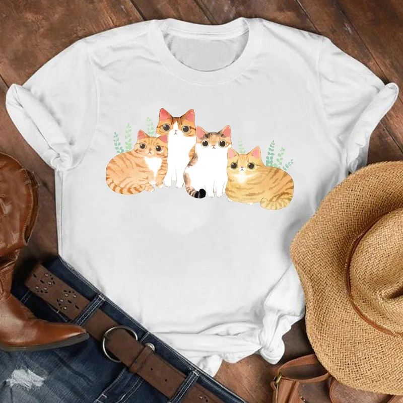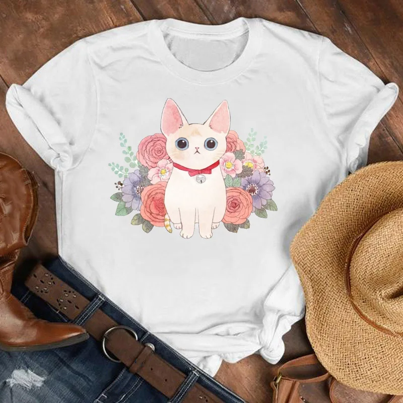 Футболка женская с мультяшным принтом кошки, милая рубашка в стиле ...