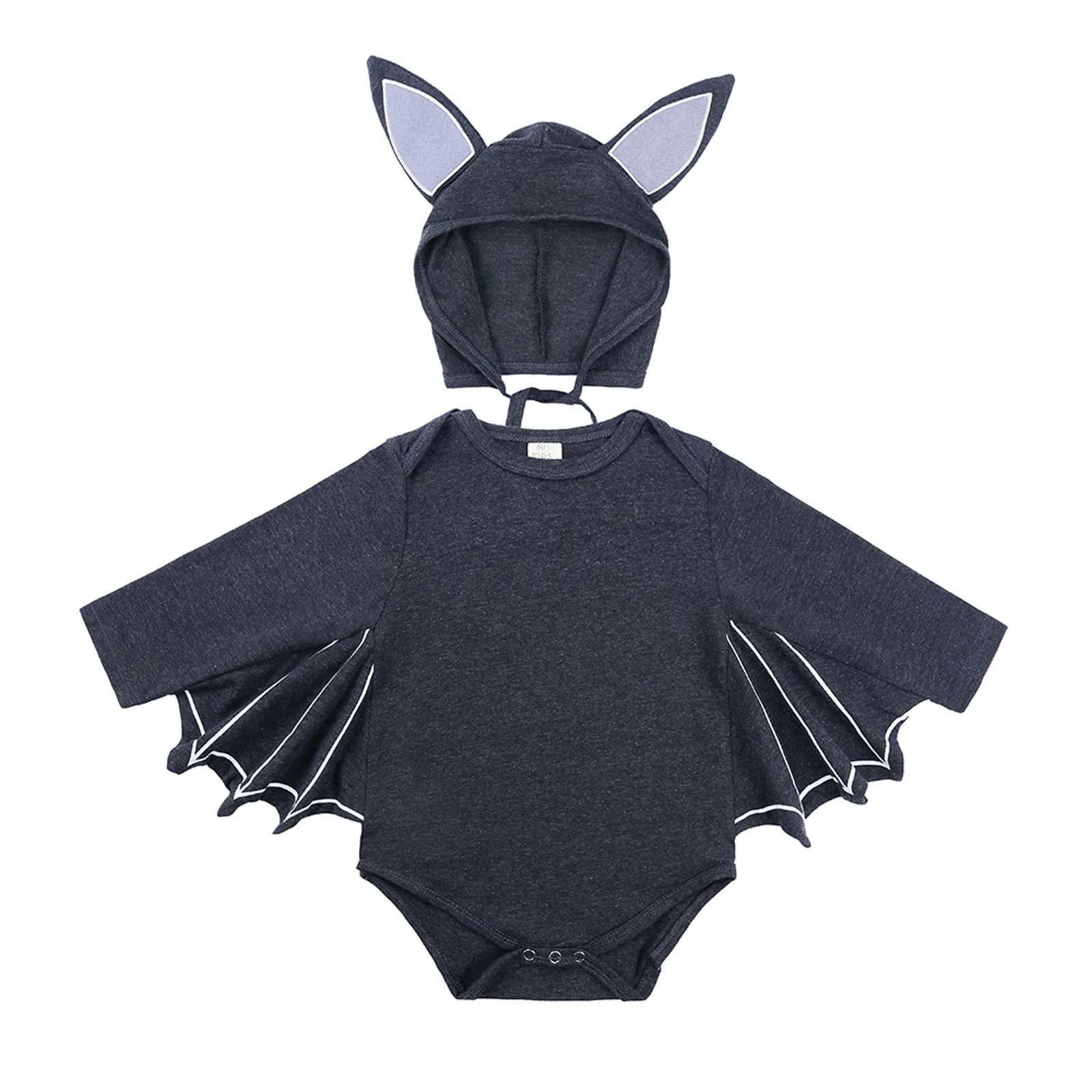 Детские костюмы для малышей, новорожденных, мальчиков и девочек, костюм для косплея на Хэллоуин, комбинезон с рукавом летучая мышь + мультяшная шапка для ушей, комплект одежды