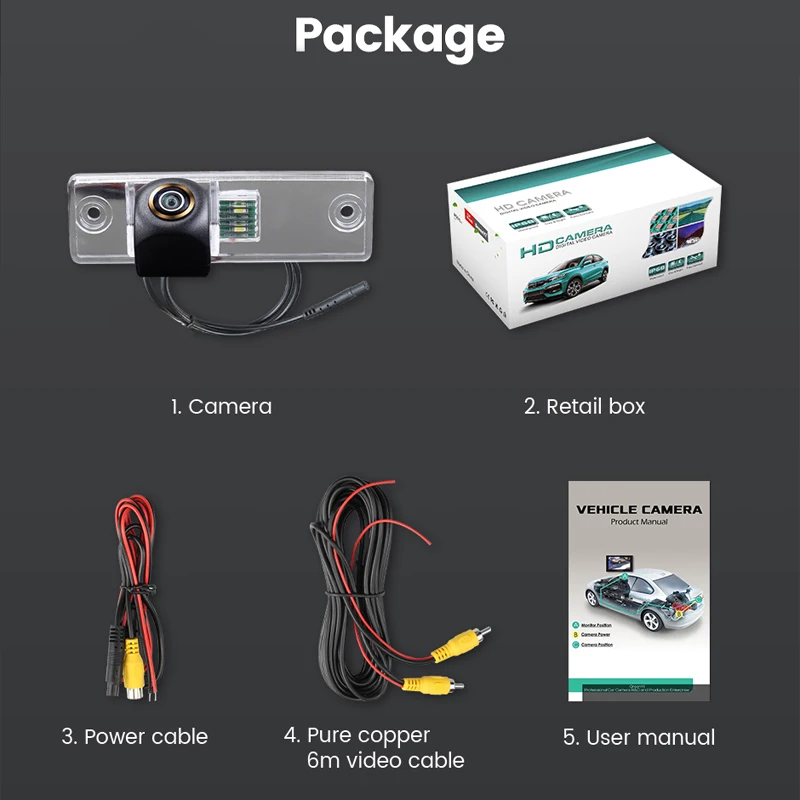 1. Камера заднего вида2. Розничная коробка3. Кабель питания4. Видеокабель из чистой меди 6 м5. Руководство пользователя