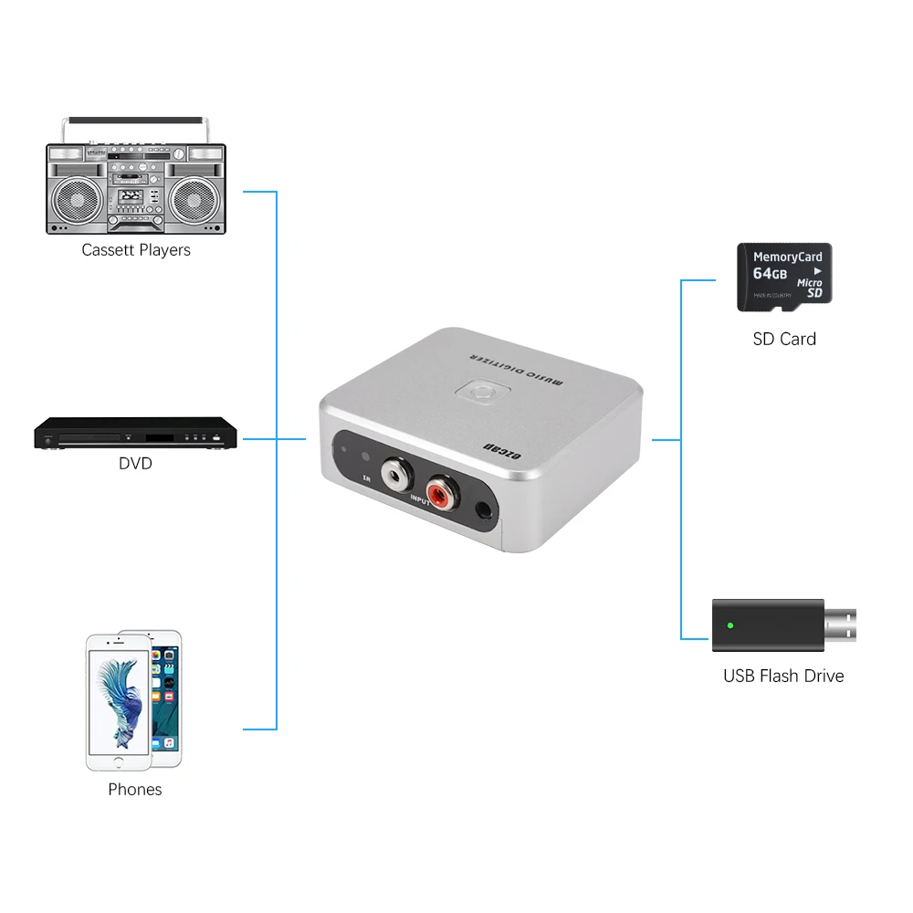 Вам просто нужно подключить USB-накопитель или SD-карту, затем нажмите кнопку «запись», устройство преобразует все