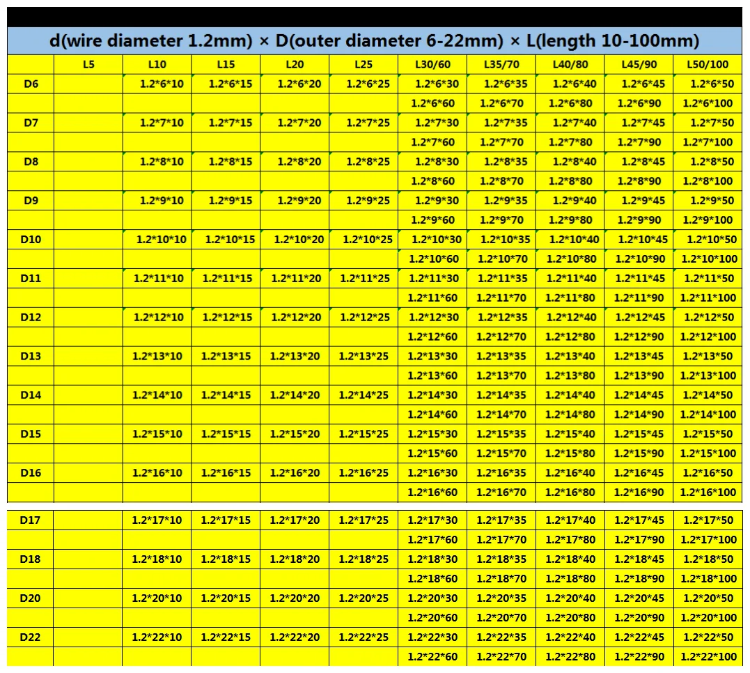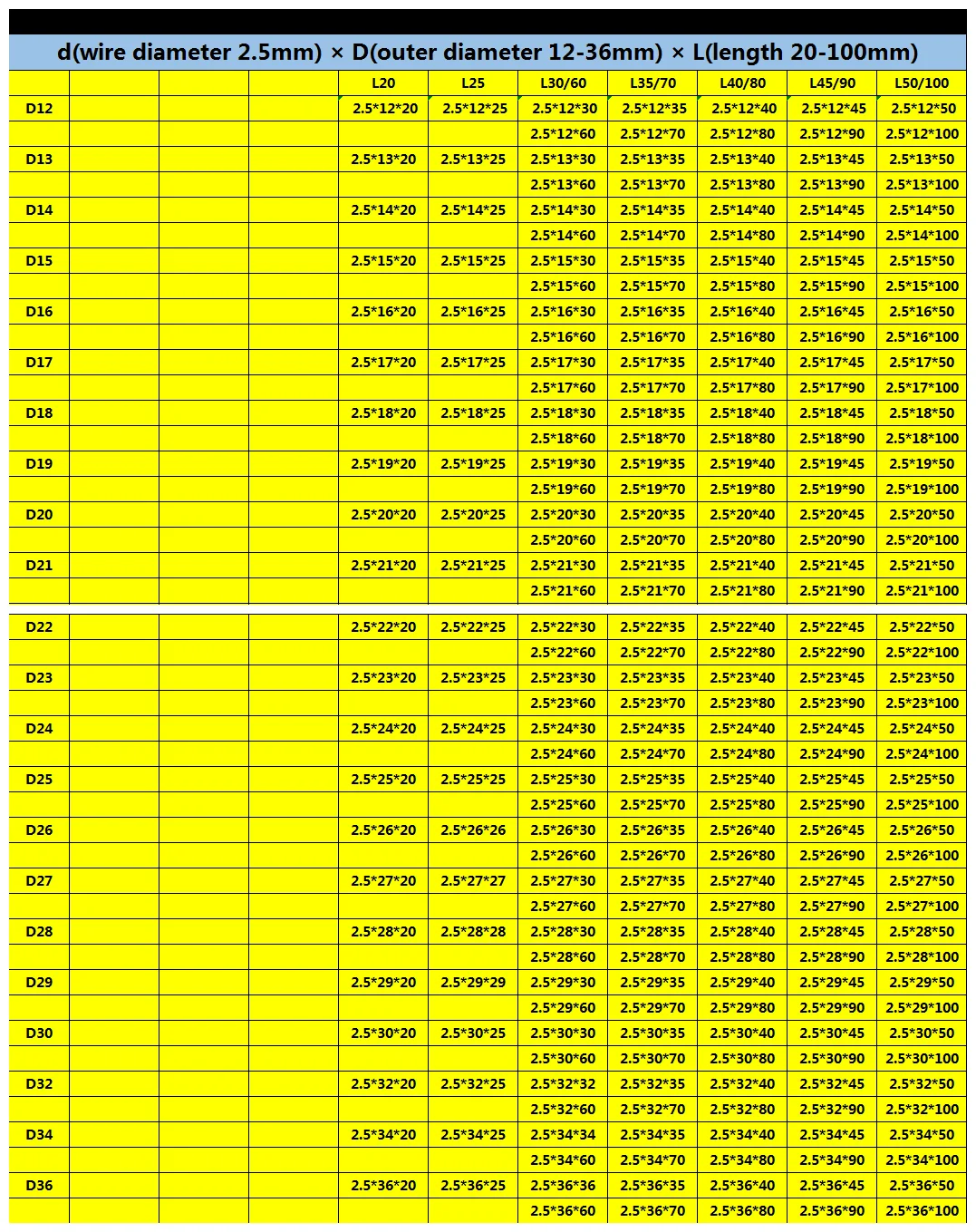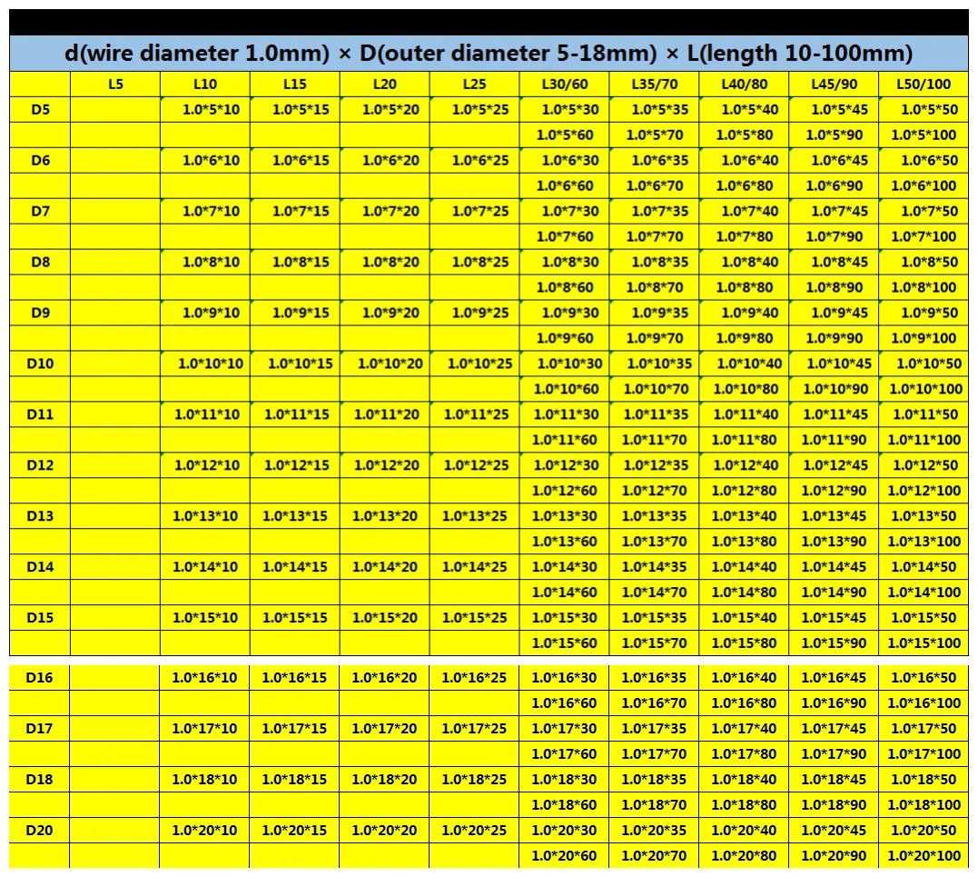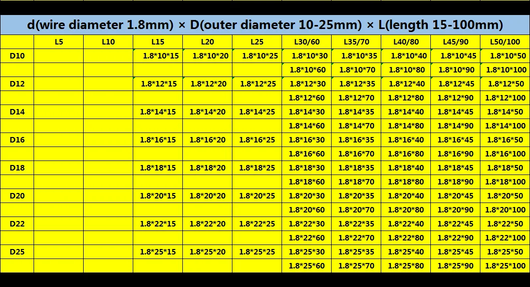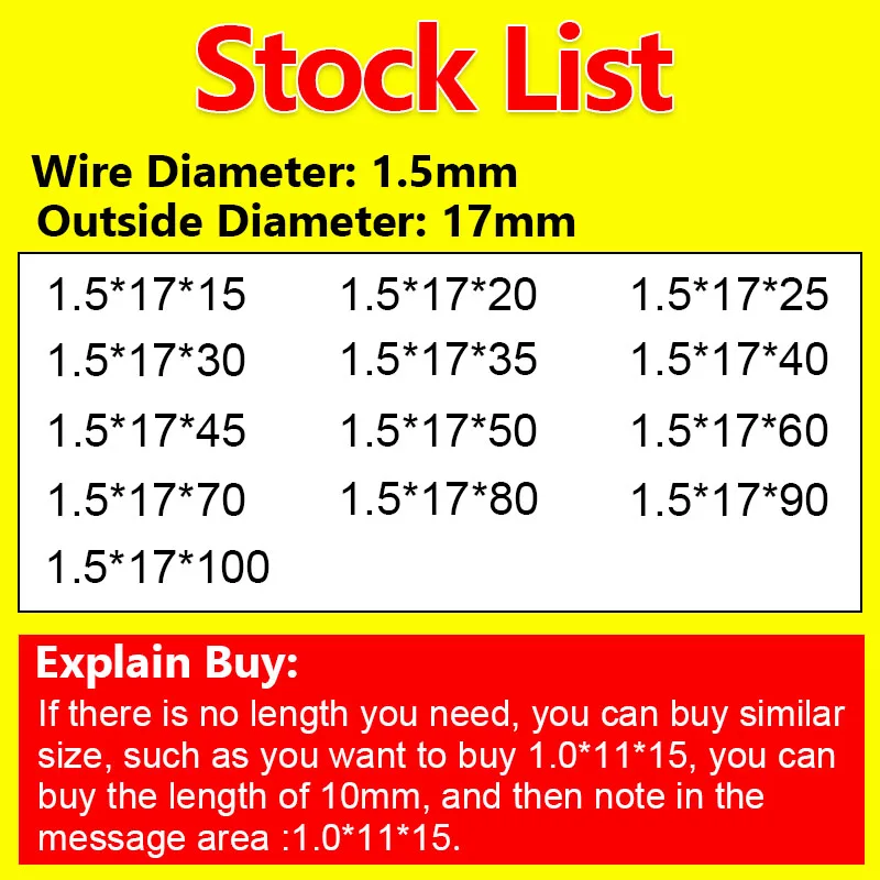 Название продукта: пружина сжатия из нержавеющей стали 304 Спецификация и количество: 10 шт/5 шт Размер изделия: диаметр провода (1,5 мм), наружный диаметр (17 мм), длина (10-100 мм) Материал изделия: нержавеющая сталь 304 Обработка поверхности: без обработки Размеры: D (диаметр провода) * D (внешний диаметр) * l (длина) Например: 1,0*11*10 (диаметр проволоки 1,0 мм, наружный диаметр 11 мм, длина 10 мм.) Ниже приводится изображение продукта:
