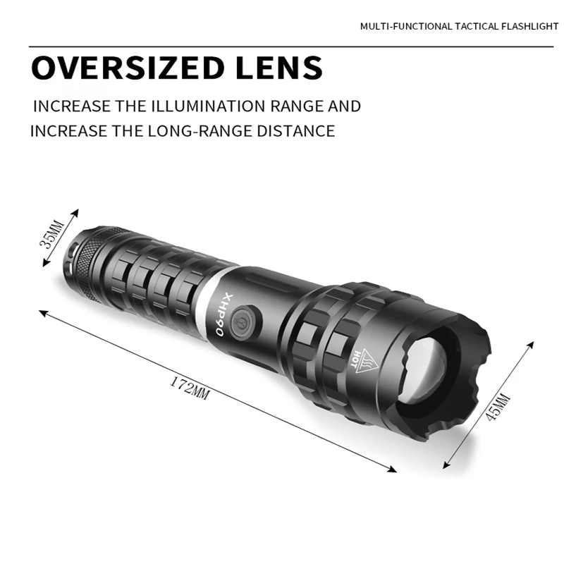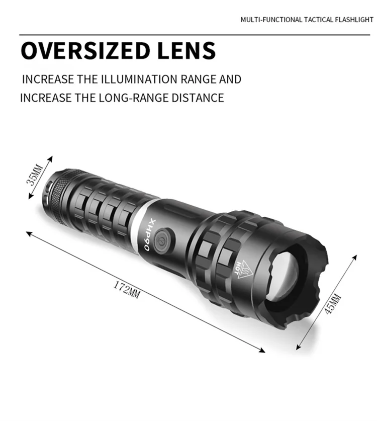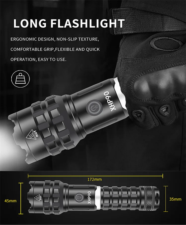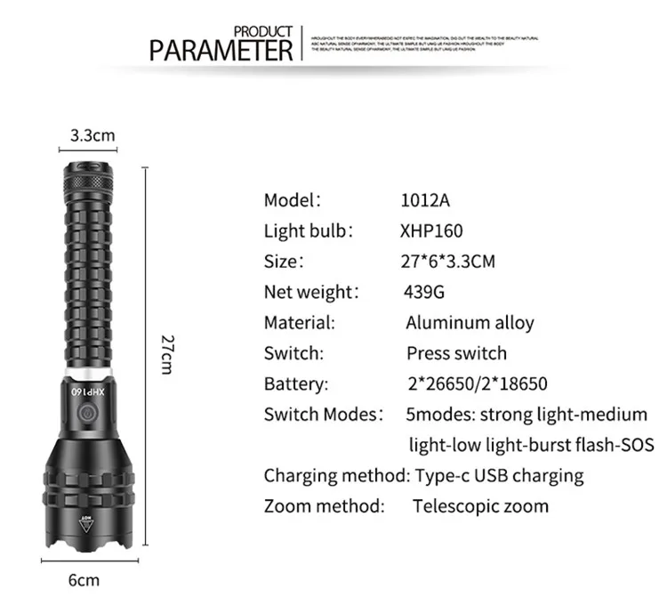 Лампы: 9-core XHP90 светодиодныйРазмер продукта: 17,2*4,5*3,5 смВес нетто: 231 гМатериал: алюминиевый сплавПереключатель: нажмите переключательАккумулятор: 1*26650/1*18650/3 * AAA (необходимо приобрести)Метод зарядки: usb-зарядка Type-c, Поддержка питания 5V1AПоложение шестерни: 5 шестерен s-сильный светильник-средний Светильник-низкий светильник-стробоскоп-SOSМетод масштабирования: телескопический зумВодонепроницаемость: IP64Диапазон: 350-450 метровЛюмен: 4800LM