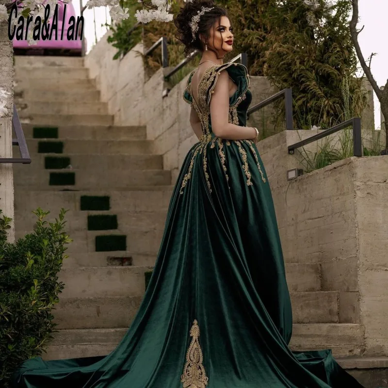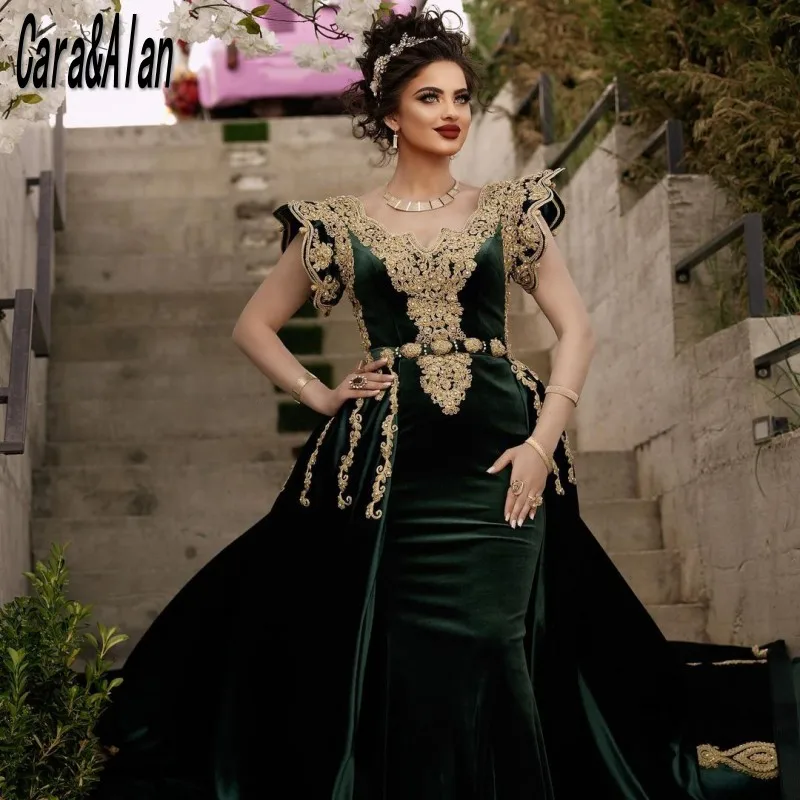 Традиционное вечернее платье, с вышивкой бисером, короткими рукавами, со съемным шлейфом, темно-зеленое платье на выпускной