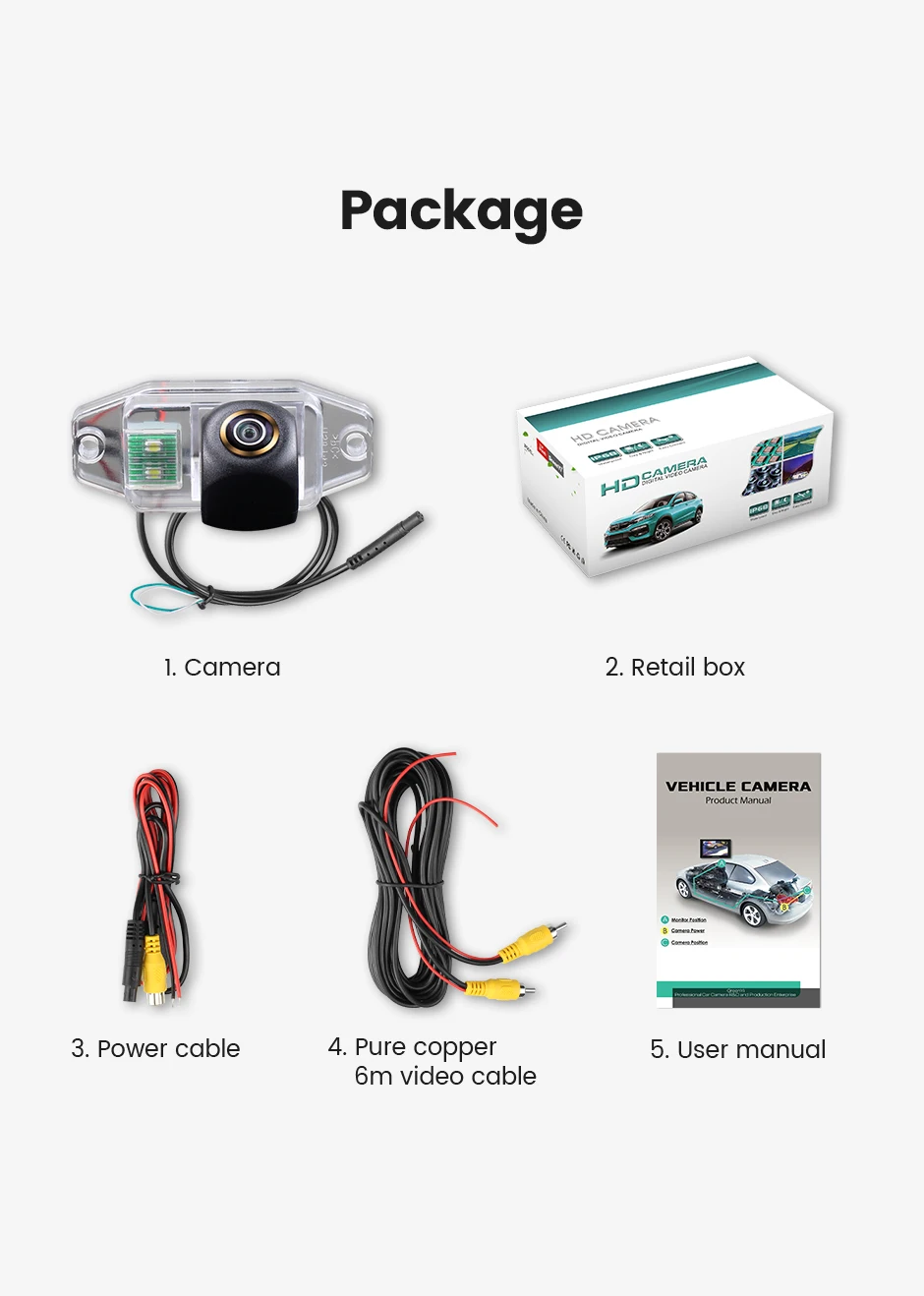 1. Камера заднего вида2. Розничная коробка3. Кабель питания4. Чистый медный 6 м видео кабель5. Руководство пользователя